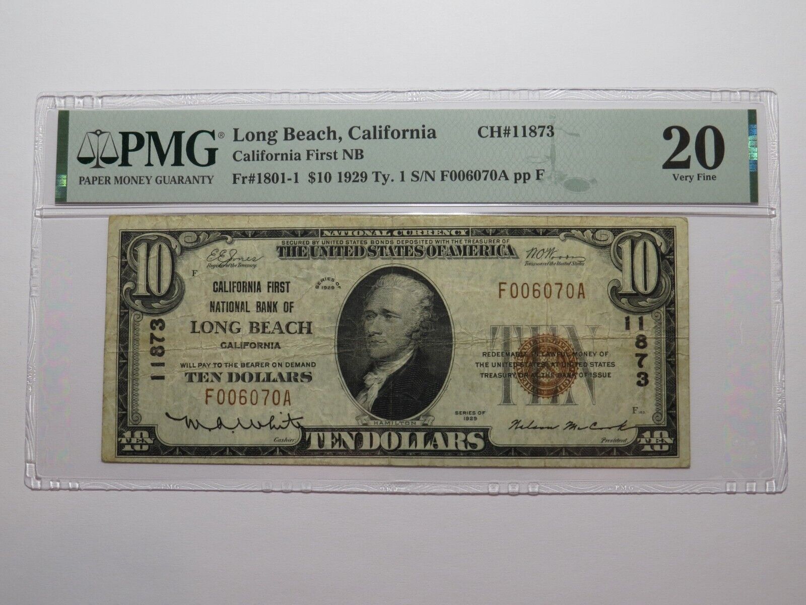 Up for auction is a $10 1929 Long Beach California Type 1 National Currency Note. This note was issued by The California First National Bank of Long Beach. It is Charter #11873. Long Beach is an always in demand California town! This note has been graded Very Fine 20 by PMG. This is a problem free note. This bill is a must have for any collector of National Currency!