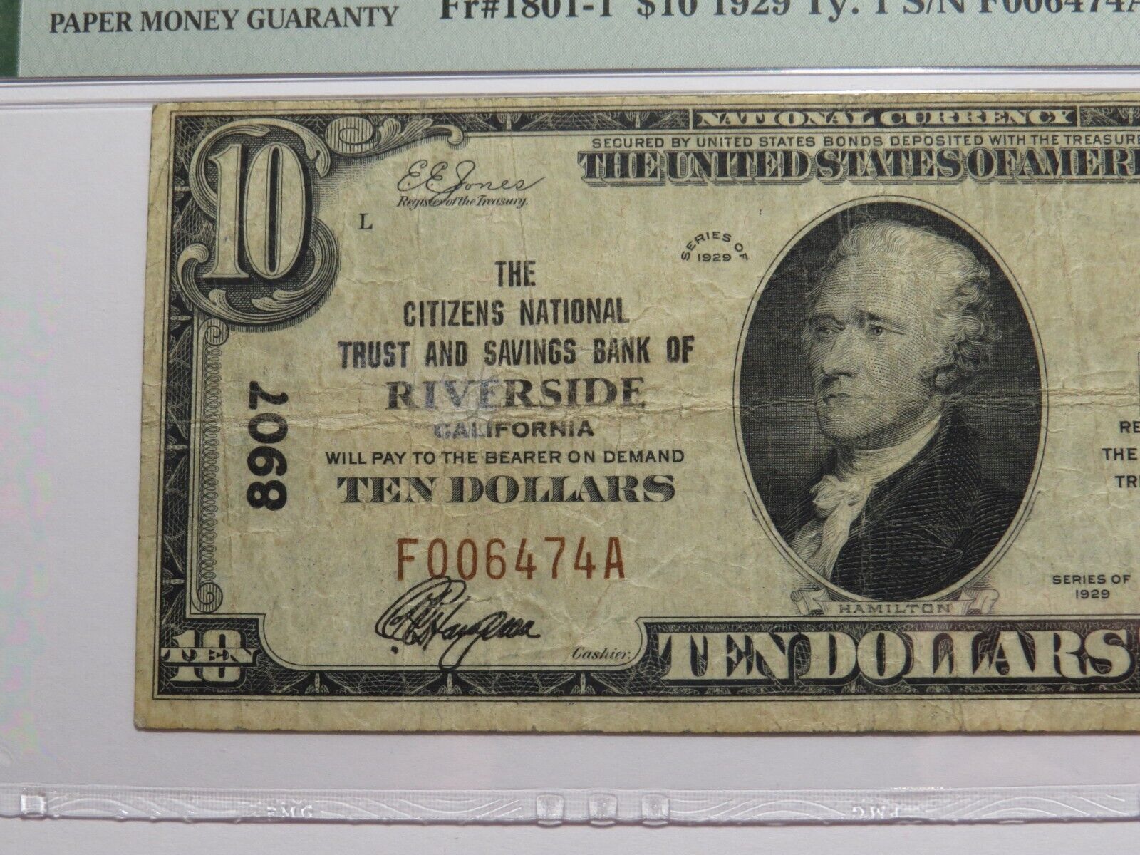Up for auction is a $10 1929 Riverside California Type 1 National Currency Note. This note was issued by The Citizens National Trust and Savings Bank of Riverside. It is Charter #8907. Riverside is an always in demand California town! This note has been graded Choice Fine 15 by PMG. This is a problem free note. This bill is a must have for any collector of National Currency!