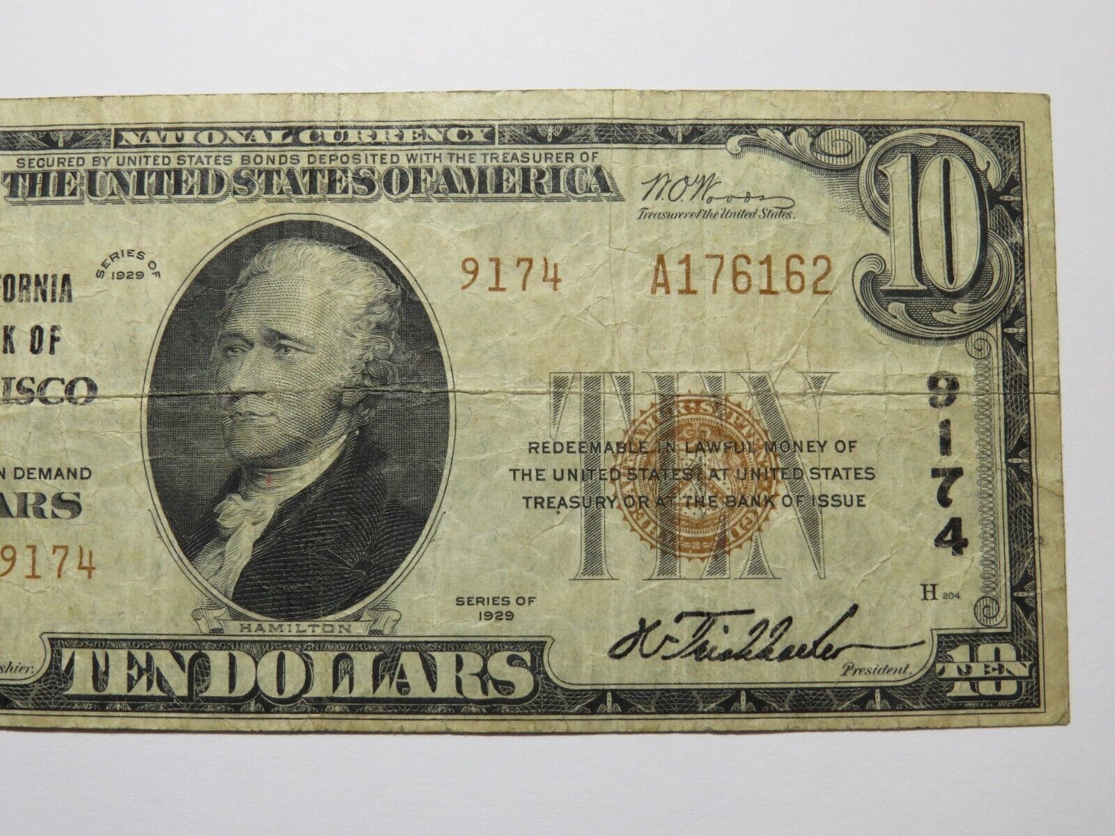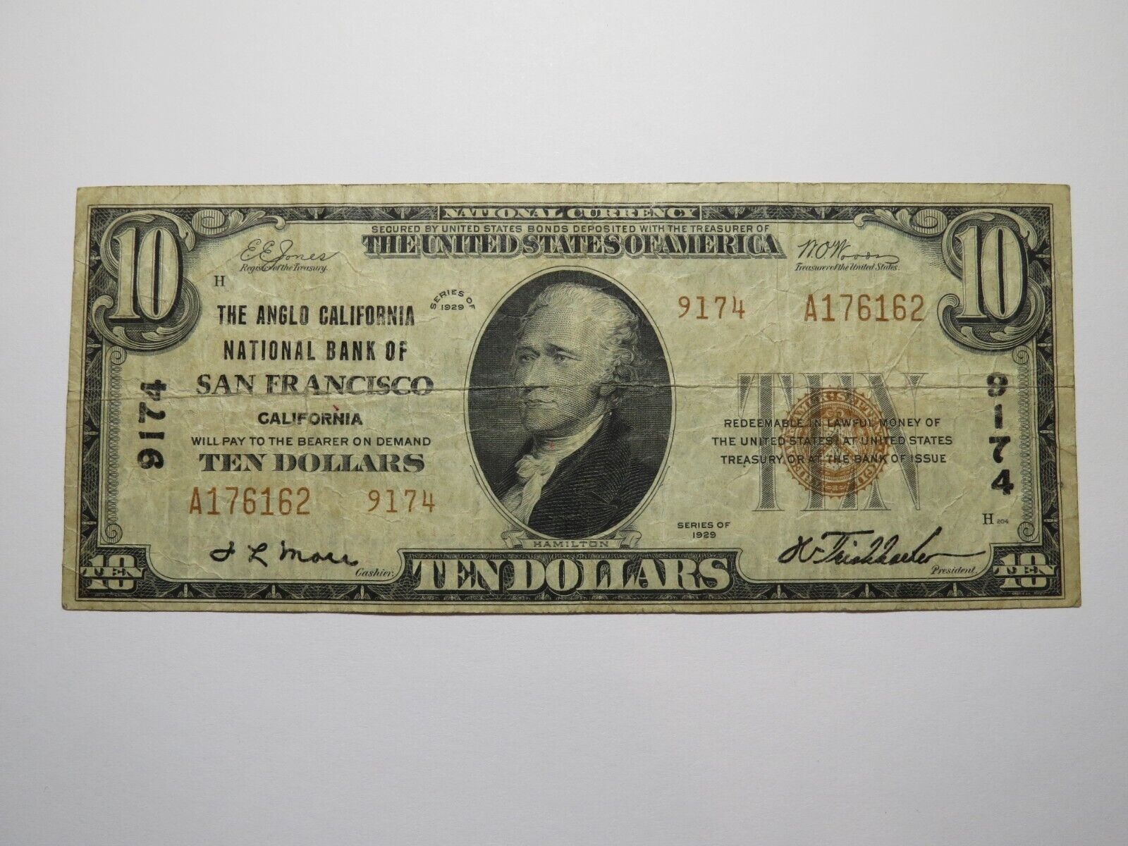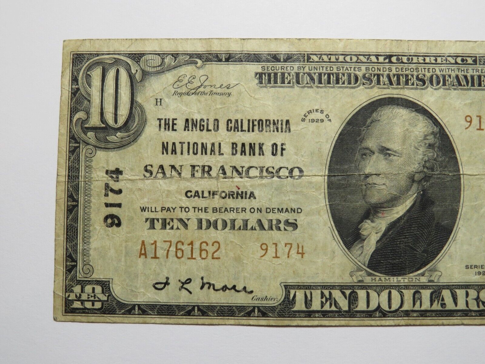 Up for auction is a $10 1929 San Francisco California National Currency Note. This note was issued by The Anglo California National Bank of San Francisco. It is Charter #9174. This is an always in demand San Francisco Charter! This bill still has a good amount of crisp left to it and is in great shape with no issues. This bill is a must have for any collector of National Currency!