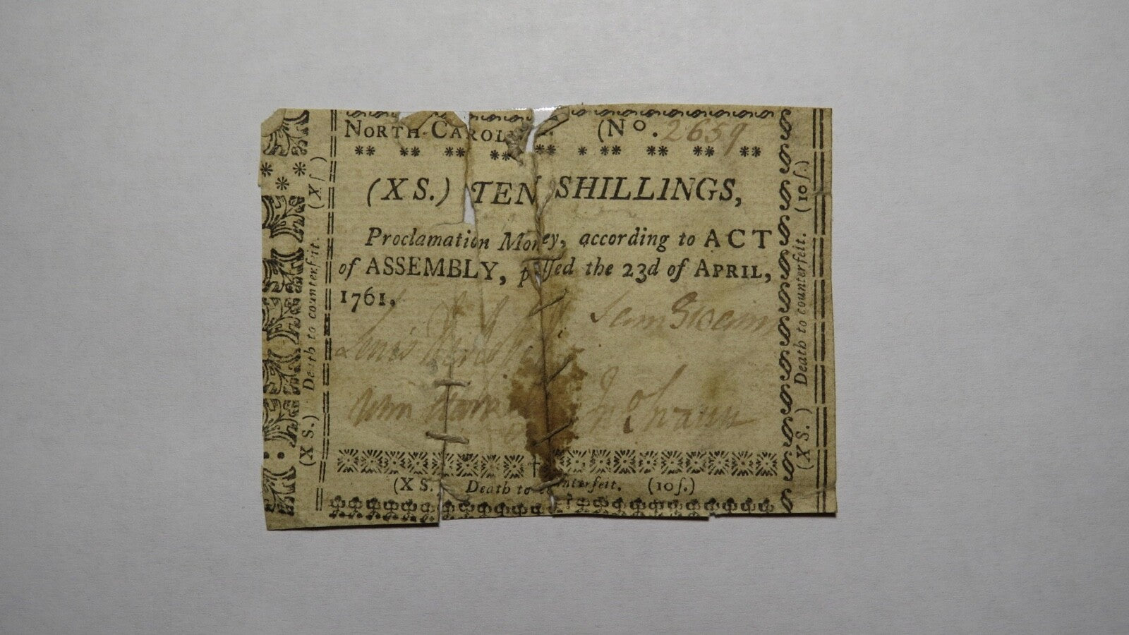 Up for auction is a 1761 Ten Shillings North Carolina Colonial Currency Note