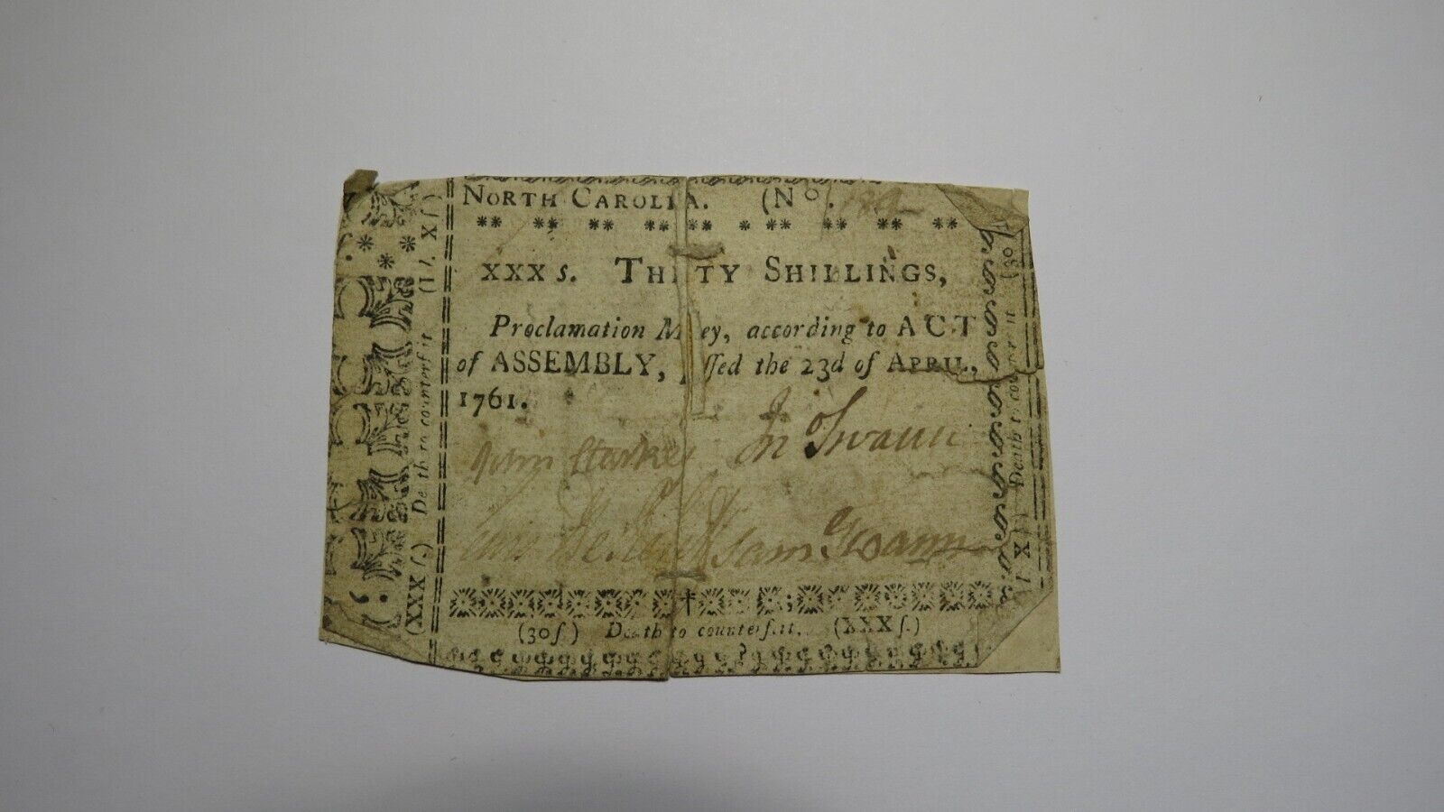 Up for auction is a 1761 Thirty Shillings North Carolina Colonial Currency Note