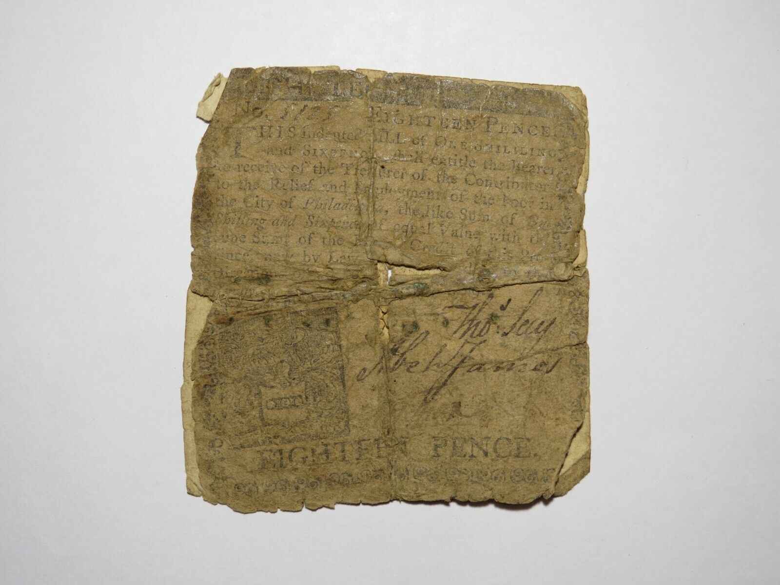1769 Eighteen Pence Pennsylvania PA Colonial Currency Bank Note Bill RARE 18d