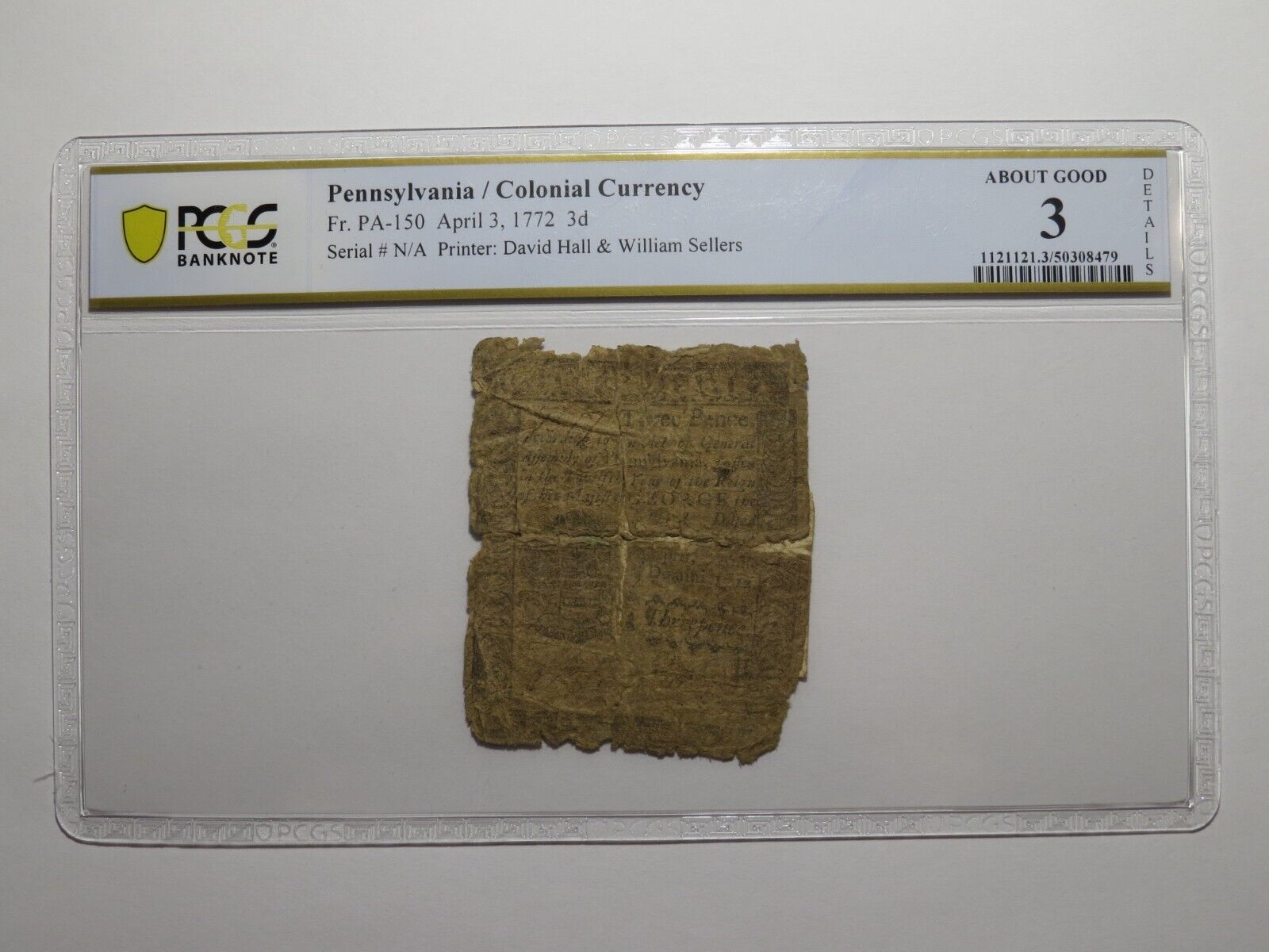 Up for auction is a 1772 Three Pence Pennsylvania Colonial Currency Note. This note is dated April 3, 1772. This note has been graded About Good 3 by PCGS. This is a great looking Pennsylvania note that is just an all around scarce issue. This bill is a must have for any collector of Colonial Currency. If you have any questions please feel free to ask!
