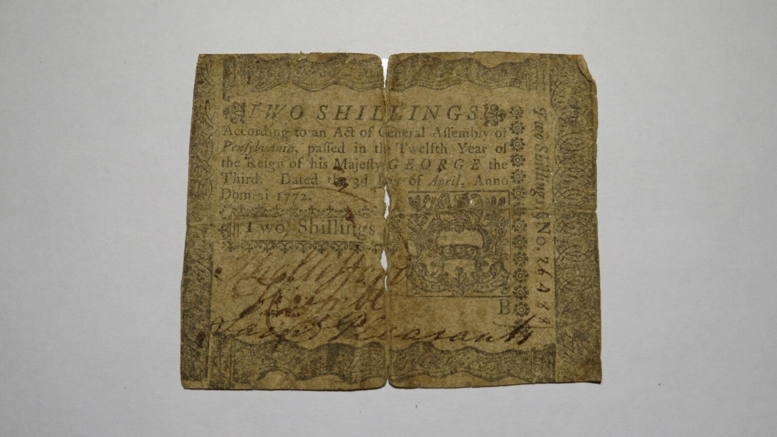 1772 Two Shillings Pennsylvania PA Colonial Currency Bank Note Bill RARE 2s