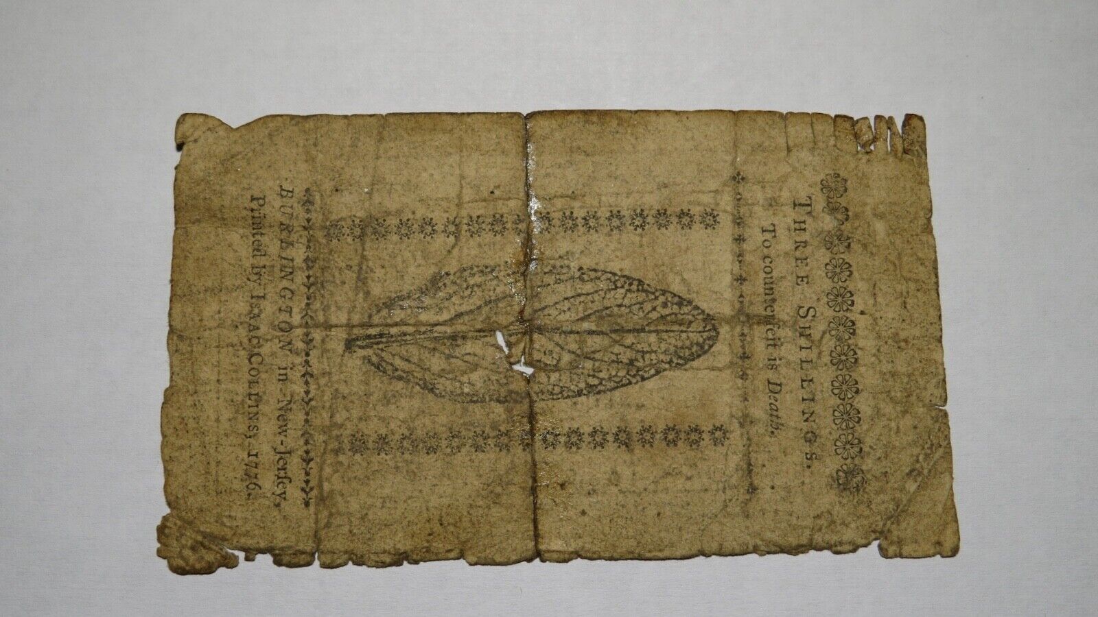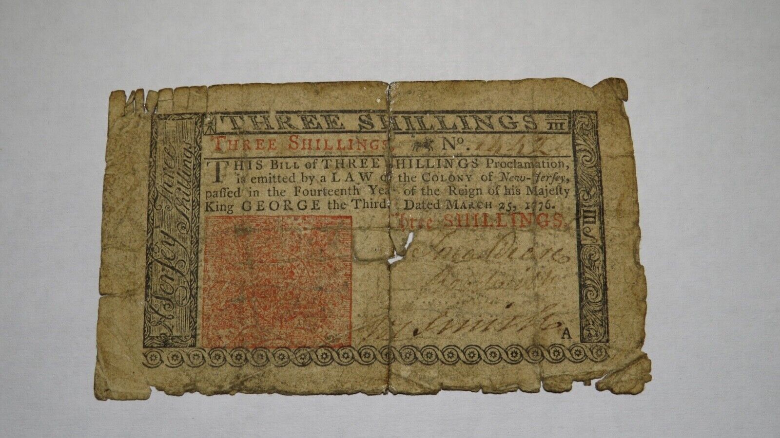 Up for auction is a 1776 Three Shillings New Jersey Colonial Currency Note