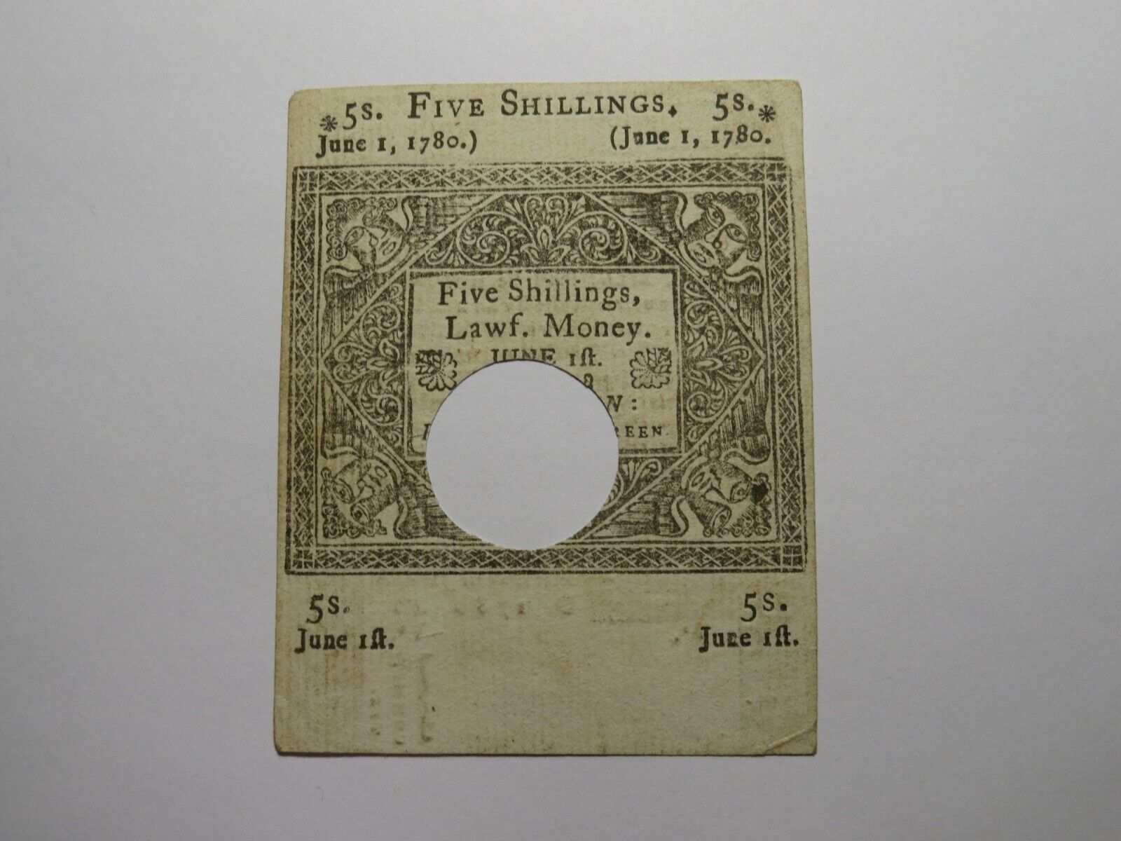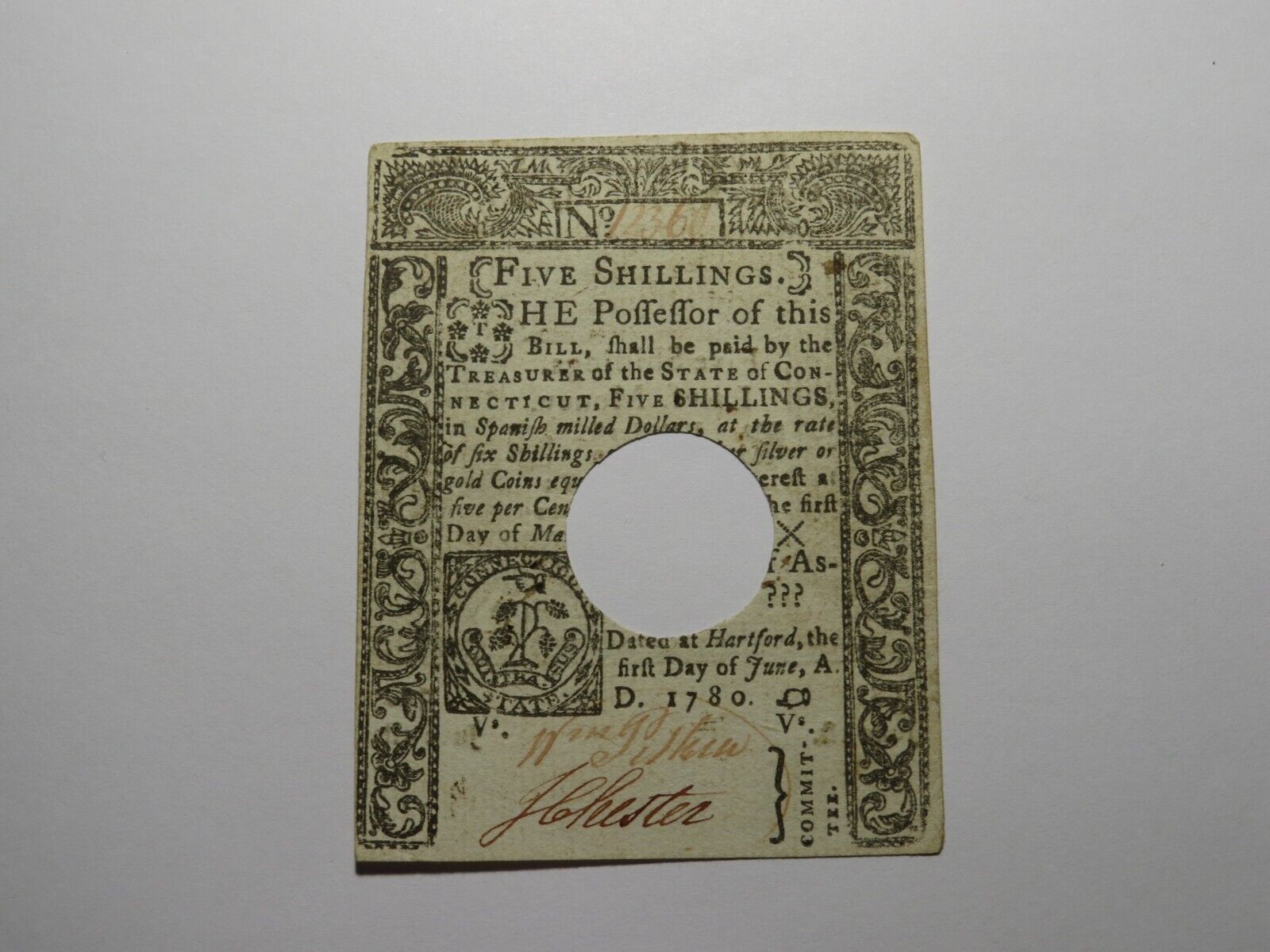 Up for auction is a 1780 5 Shillings Hartford Connecticut Colonial Currency Note. This note is dated June 1, 1780. This note has been hole cancelled. This is a great looking Connecticut note that is just an all around scarce issue. This bill is a must have for any collector of Colonial Currency!