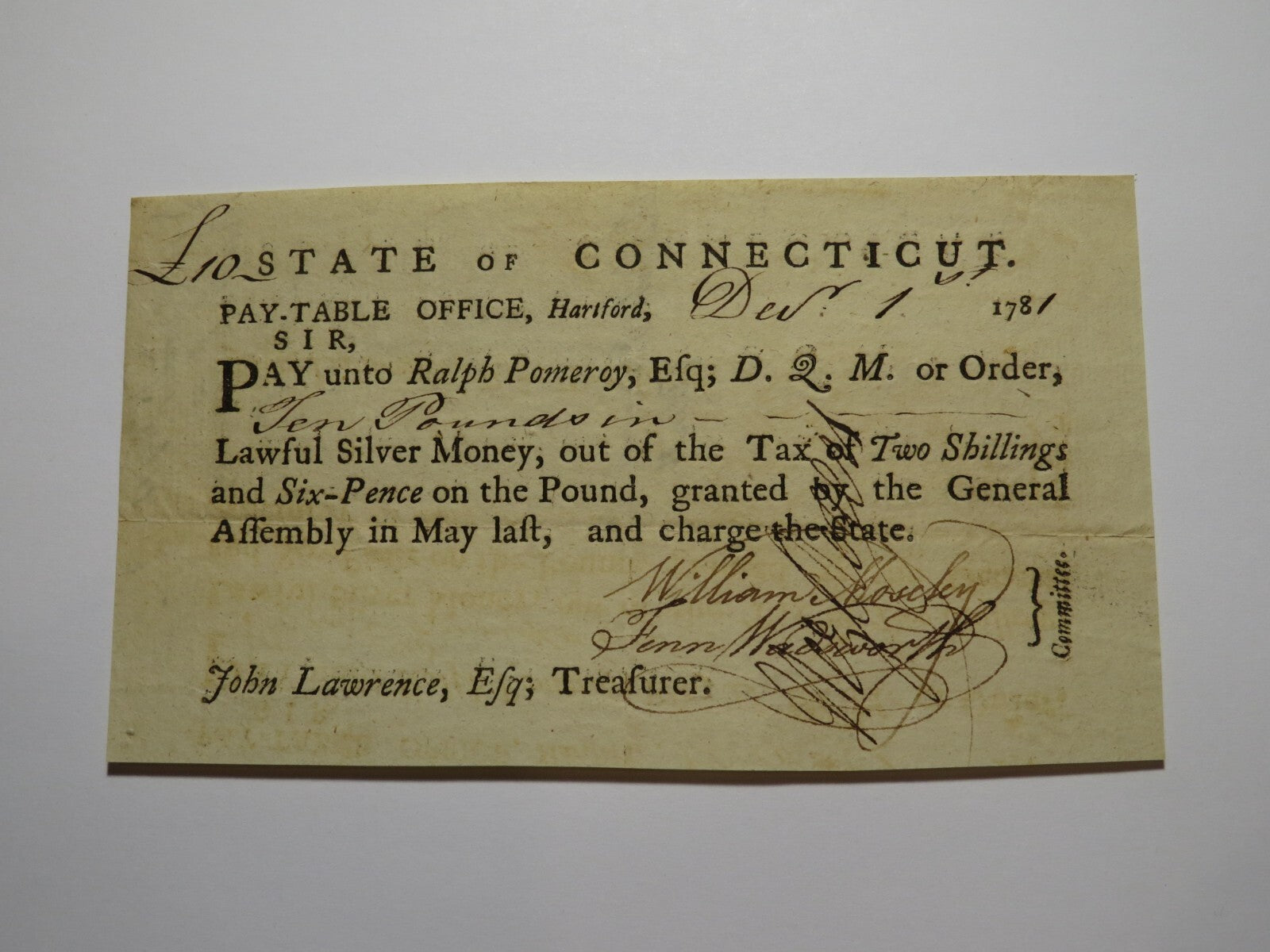 Up for auction is a 1781 Ten Pounds Connecticut Pay Table Office Colonial Currency Note. The note is dated December 1, 1781.  This note has been hand signed by Finn Wadsworth, Ralph Pomeroy and William Mosley.  This is a gorgeous Pay Table from the earliest days of this country.  This bill is a must have for any collector of Colonial Currency!