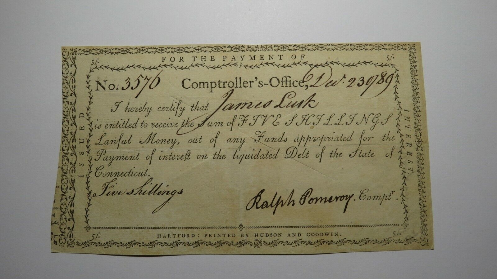 Up for auction is a 1789 5 Shillings Comptroller's Office Certificate. This certificate is dated December 23, 1789. This note has been hand signed by Ralph Pomeroy who was the state treasurer of Connecticut and a major player in the Revolutionary War. This note has been cross cut cancelled. This bill is a must have for any collector of Colonial Currency!