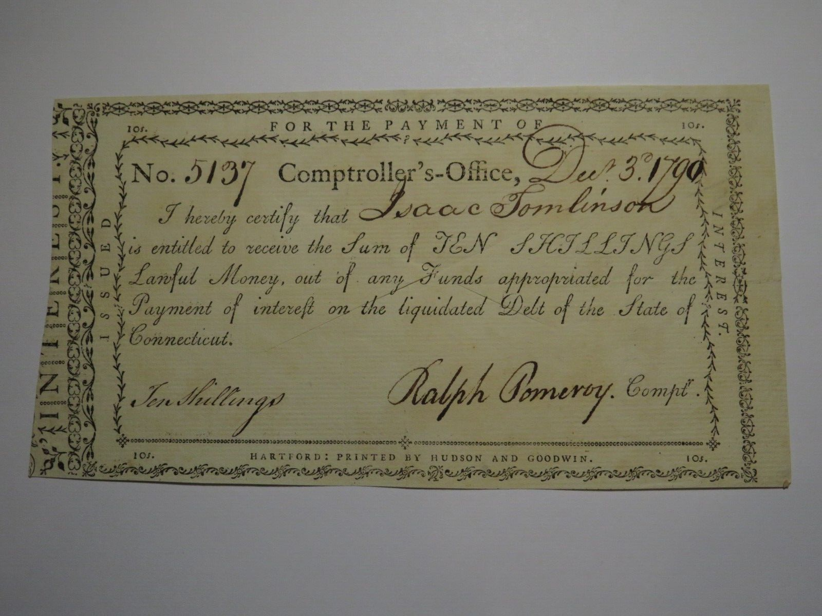 Up for auction is a 1790 Ten Shillings Comptroller's Office Certificate. This certificate is dated December 3, 1790. This note was hand signed by Ralph Pomeroy. Pomeroy was a prominent figure within the Continental Army. This note has been cross cut cancelled. This bill is a must have for any collector of Colonial Currency!