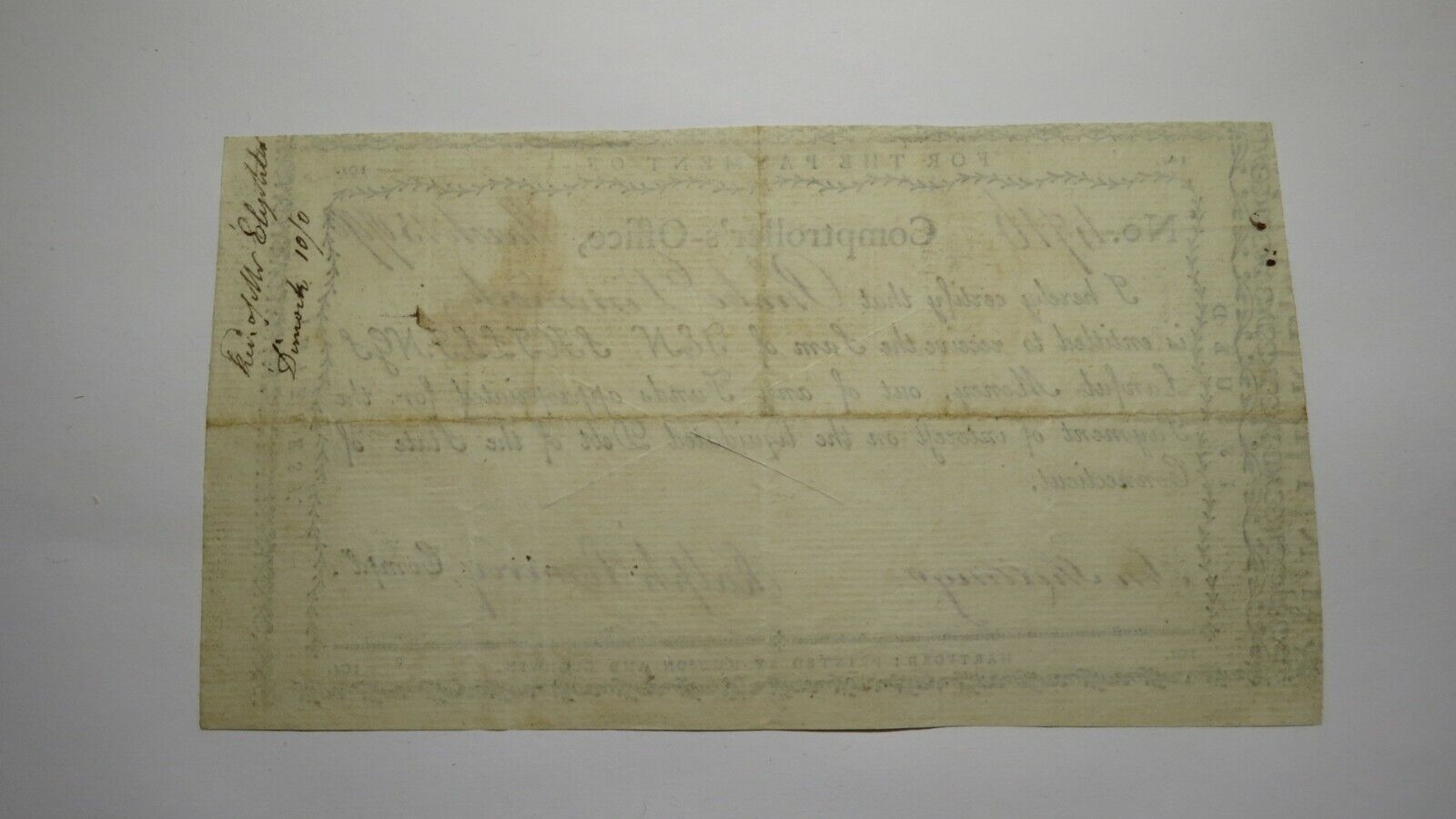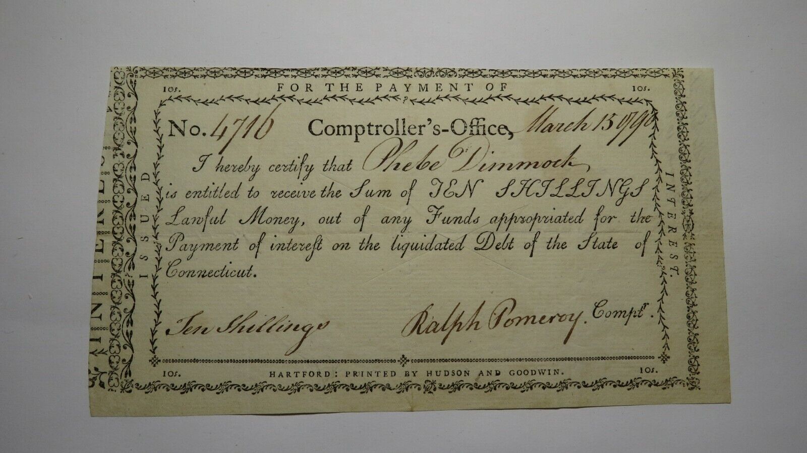 Up for auction is a 1790 Ten Shillings Comptroller's Office Certificate. This certificate is dated March 13, 1790. This note has been hand signed by Ralph Pomeroy who was the state treasurer of Connecticut and a major player in the Revolutionary War. This note has been cross cut cancelled. This bill is a must have for any collector of Colonial Currency!