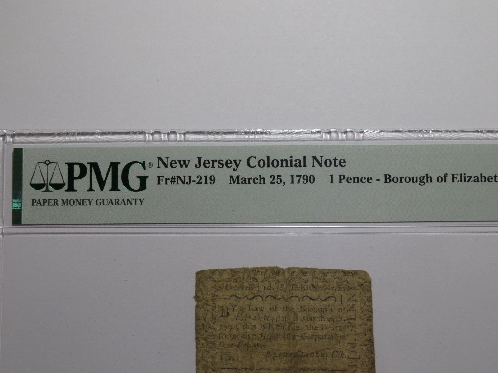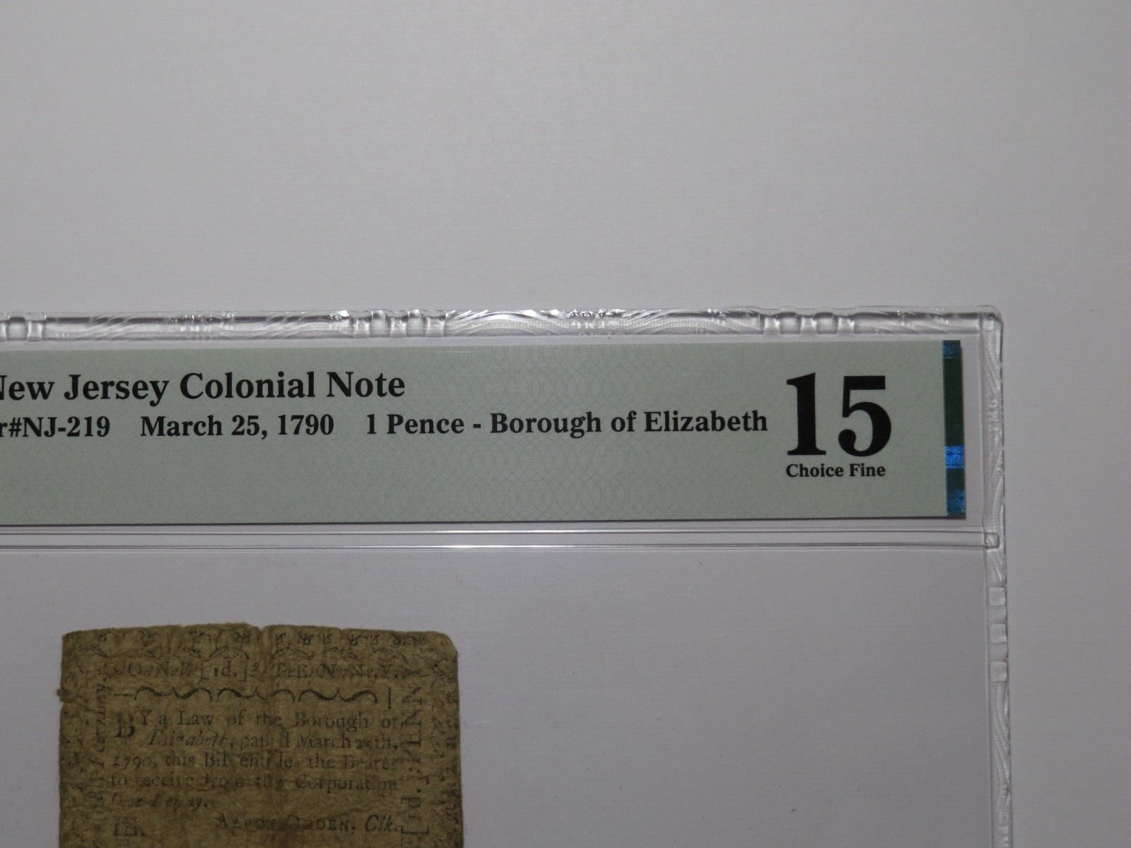 Up for auction is a 1790 One Pence New Jersey Colonial Currency Note. This note is from the Borough of Elizabeth. This note is dated March 25, 1790. This note has been graded Choice Fine 15 by PMG. This is a great New Jersey note that is just an all around scarce issue. This bill is a must have for any collector of Colonial Currency!