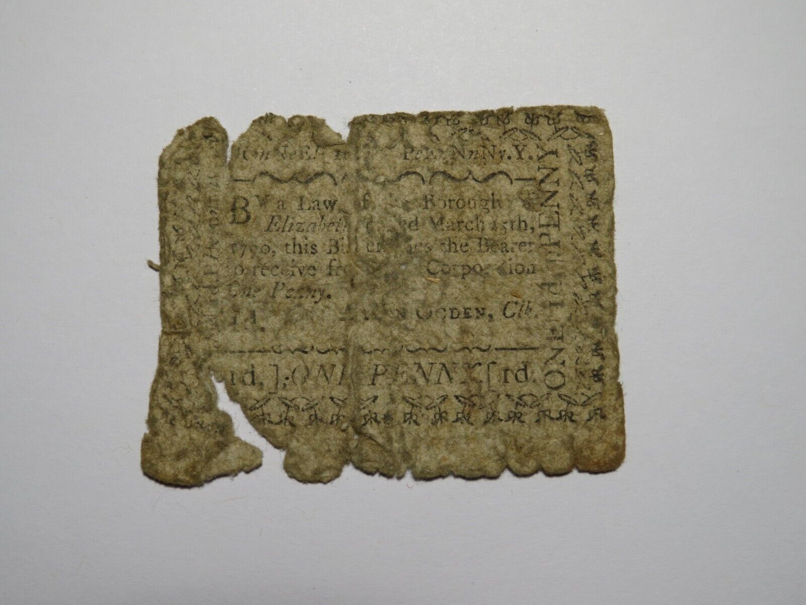 Up for auction is a 1790 One Penny New Jersey Colonial Currency Note. This note was from the Borough of Elizabeth. This note is dated March 25, 1790. This is a great New Jersey note that is just an all around scarce issue. This bill is a must have for any collector of Colonial Currency!