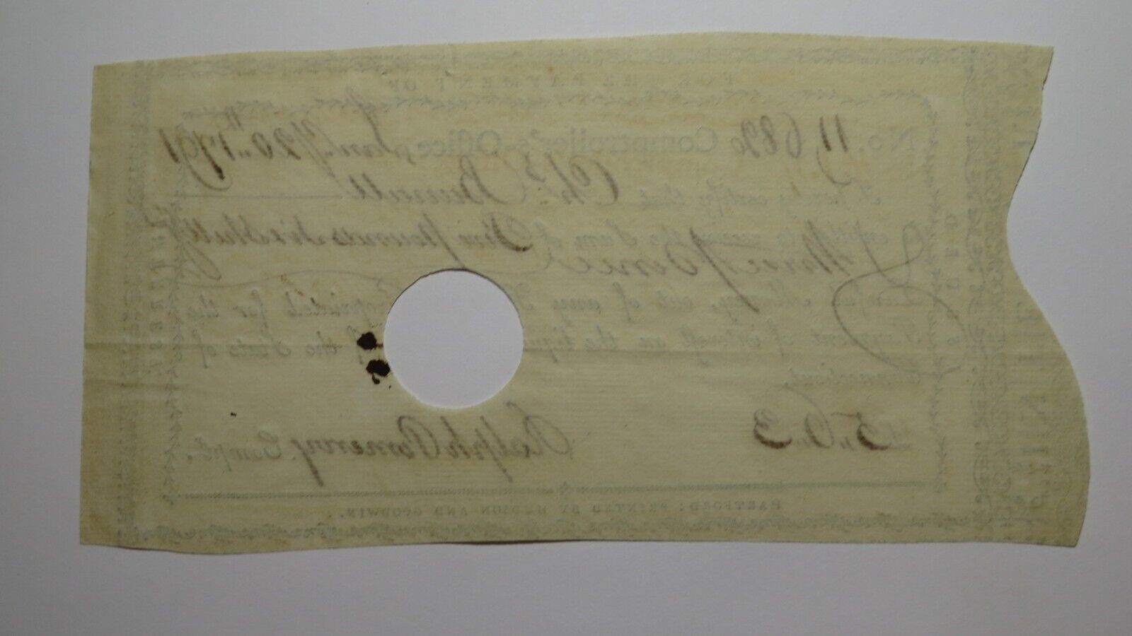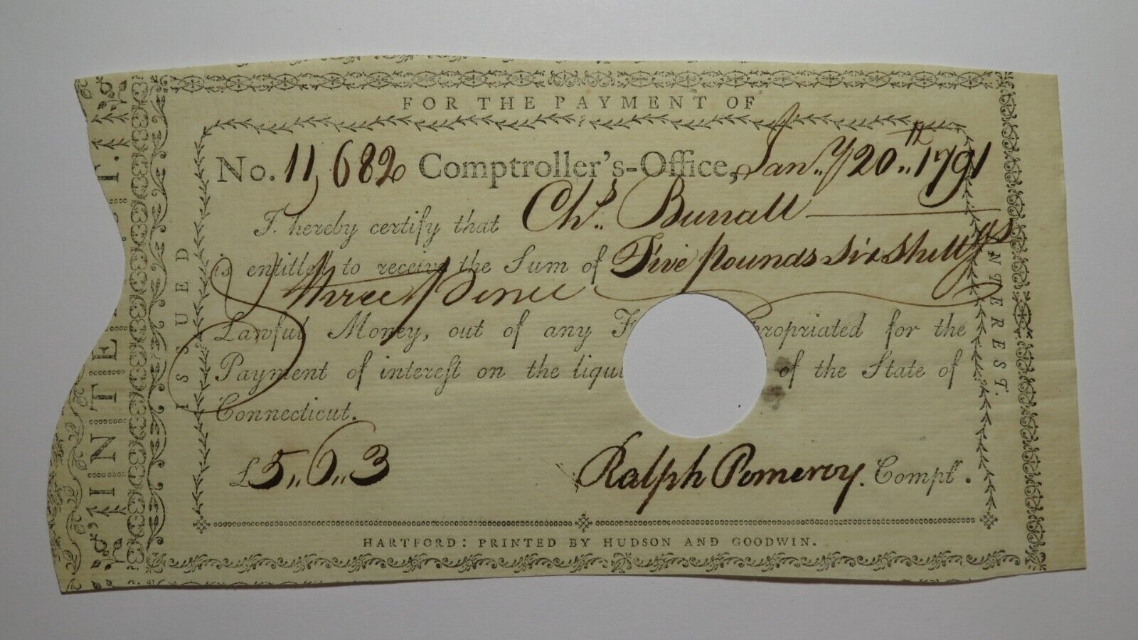 Up for auction is a 1791 Five Pounds Six Shillings Comptroller's Office Certificate. This certificate is dated January 20, 1791. This note has been hand signed by Ralph Pomeroy who was the state treasurer of Connecticut and a major player in the Revolutionary War. This note has been hole punch cancelled. This bill is a must have for any collector of Colonial Currency!