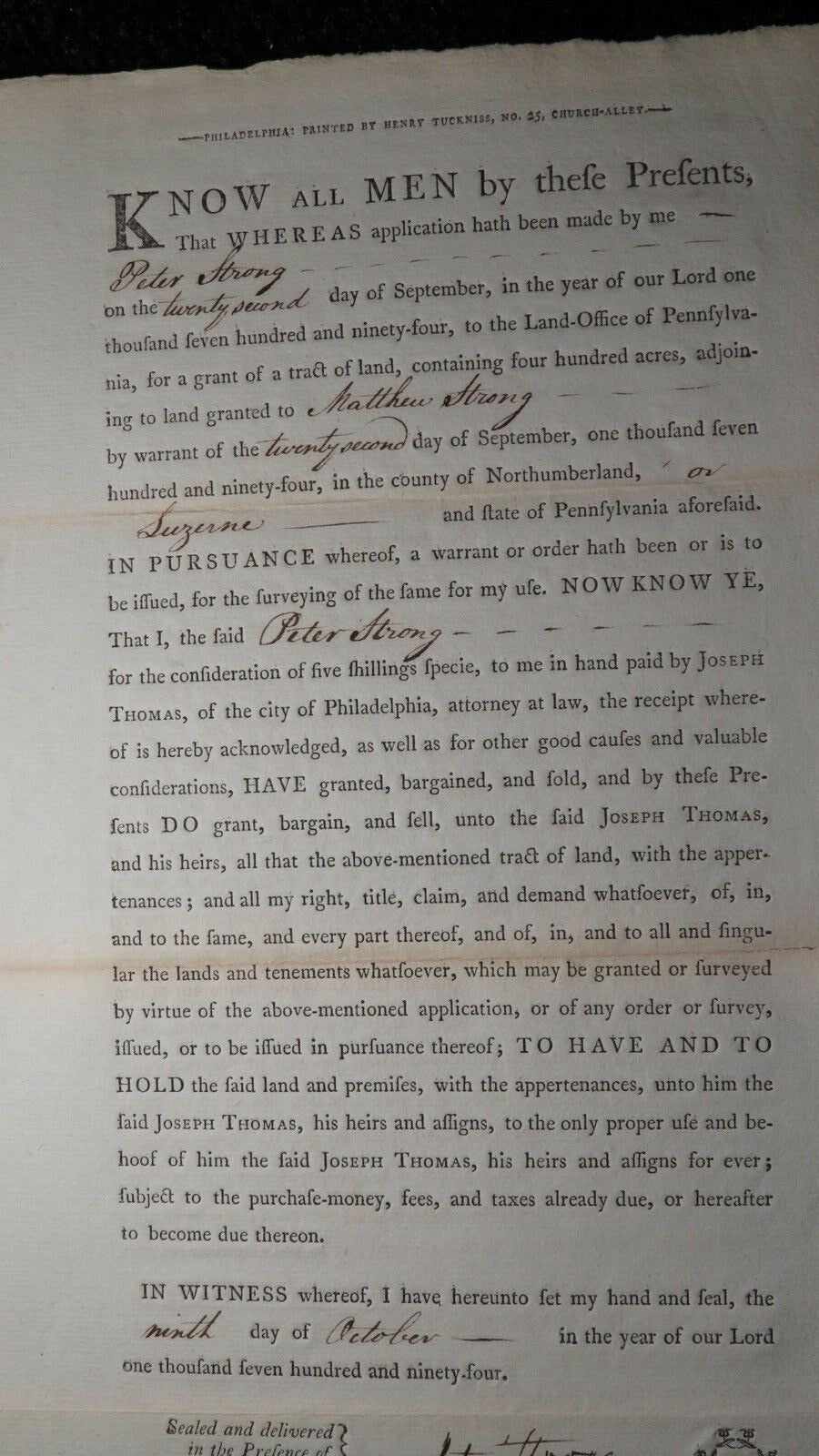 1794 Northumberland Pennsylvania PA Colonial Currency Land Grant 400 Acres RARE