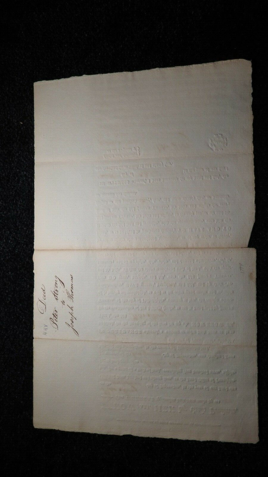 Up for auction is a 1794 Northumberland Pennsylvania Colonial Land Grant. The note is dated October 9, 1794.  This grant was applied for by Peter Strong, and was for 400 acres of land in Northumberland PA.  This is a large piece of parchment that is roughly as wide as a piece of standard copy paper and bout 4 inches longer.  This is a gorgeous Land Grant from the earliest days of this country.  This grant is a must have for any collector of Colonial Currency!