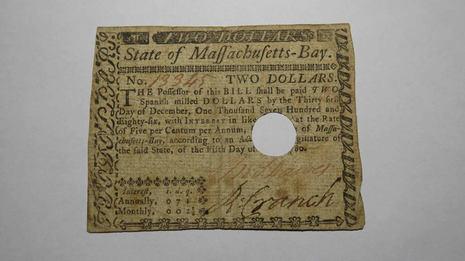 1780 $2 Massachusetts Bay Colonial Currency Note!