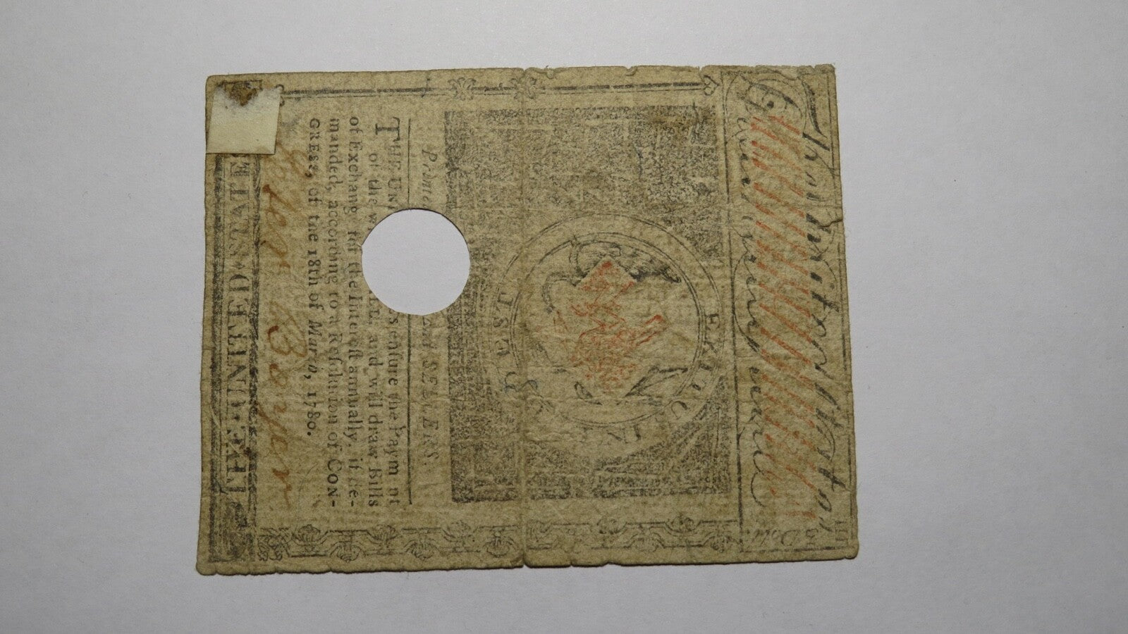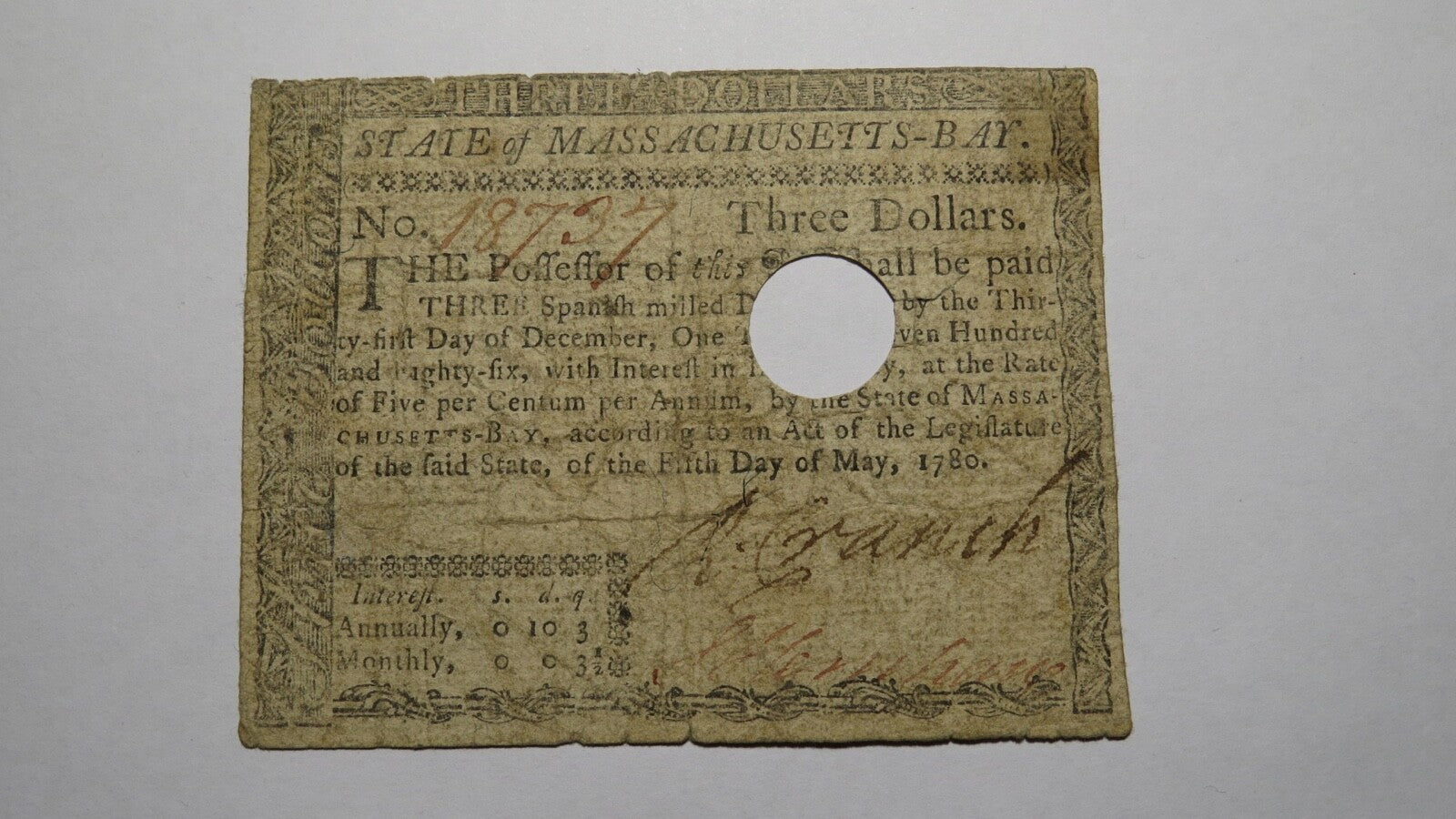 Up for auction is a 1780 $3 Massachusetts Bay Colonial Currency Note. This note is dated May 5, 1780. This note has been hole cancelled. This is a great looking Massachusetts note that is just an all around scarce issue. This bill is a must have for any collector of Colonial Currency!