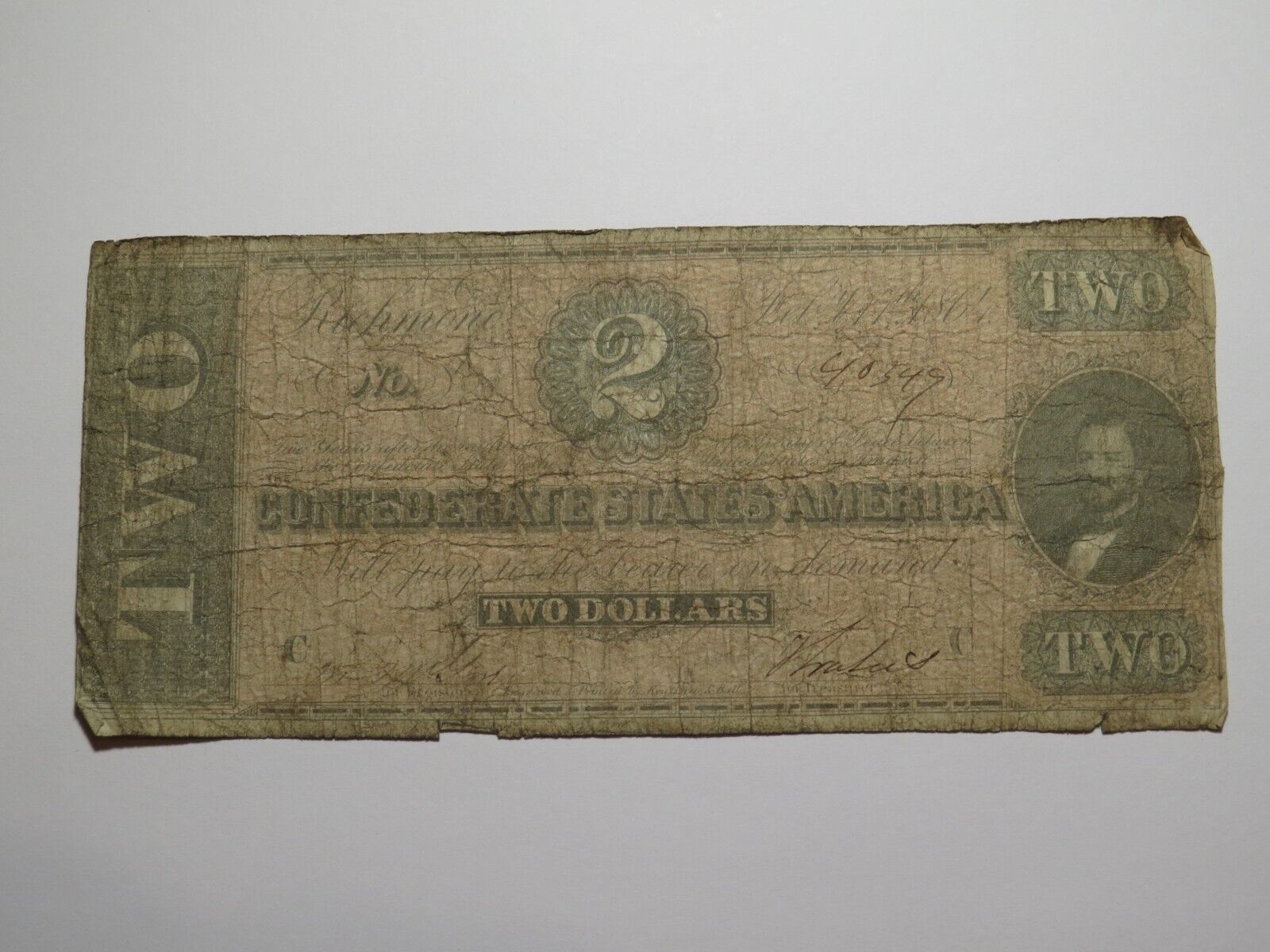 $2 1864 Richmond Virginia VA Confederate Currency Bank Note Bill RARE T70 Good