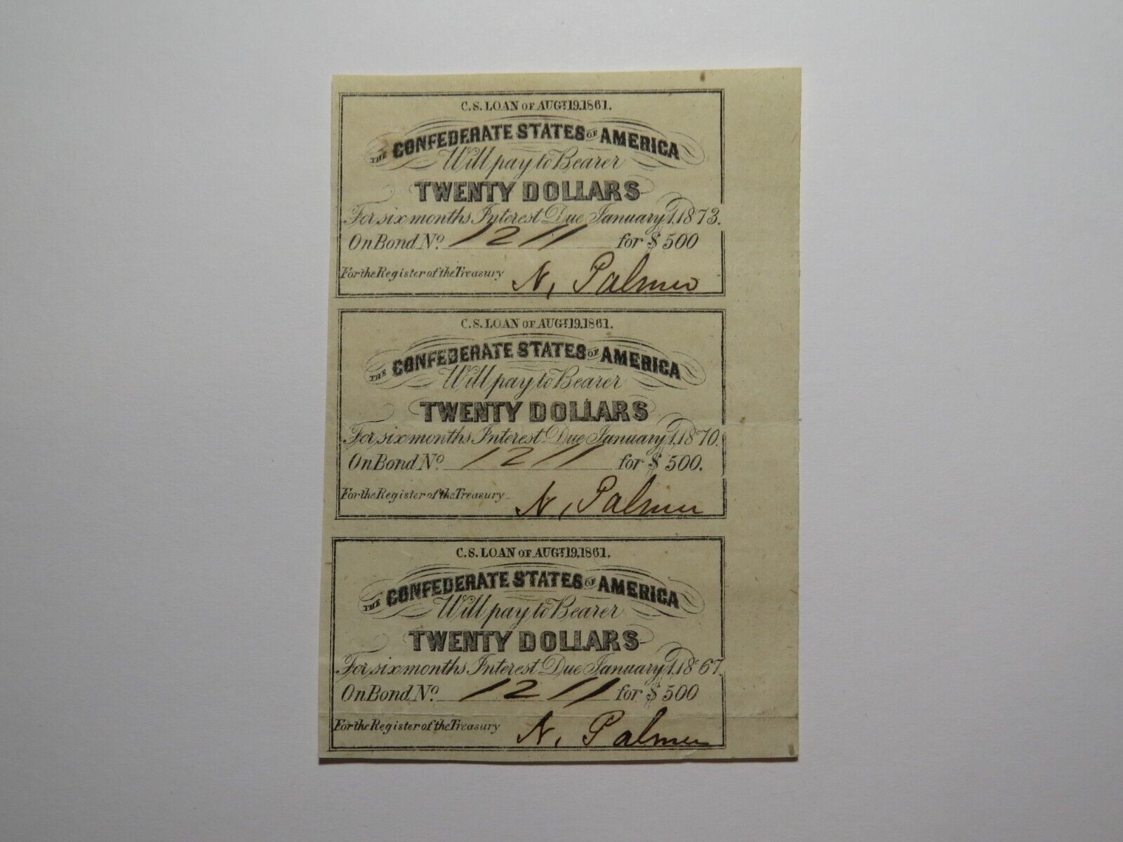 Up for auction is a $20 1861 Confederate Bond Coupon Uncut Sheet of Three Notes. This sheet is dated August 19, 1861. This sheet is in Uncirculated condition! This bill is a must have for any collector of Confederate Currency. If you have any questions please feel free to ask.