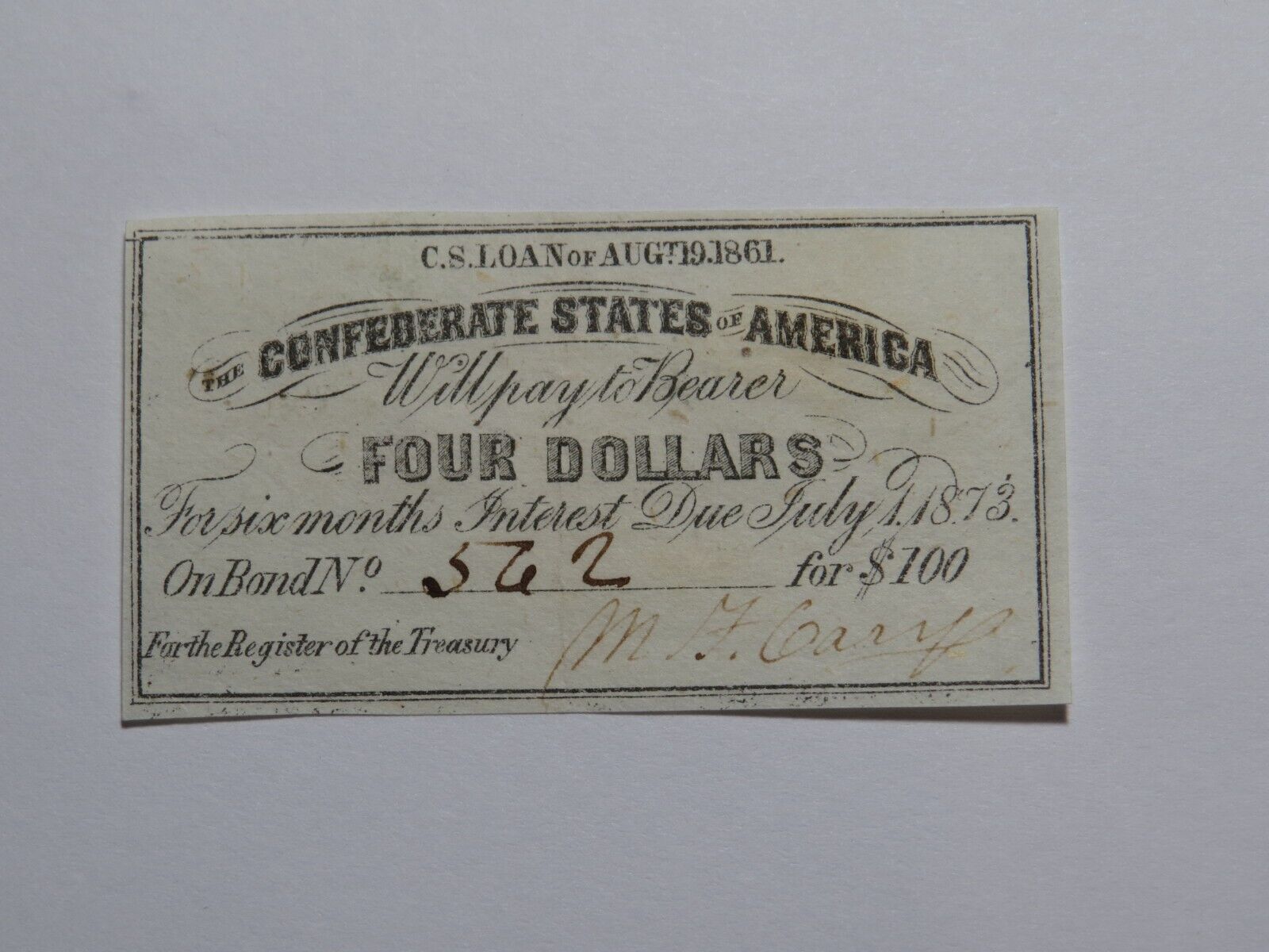 Up for auction is a $4 1861 Confederate Bond Coupon
