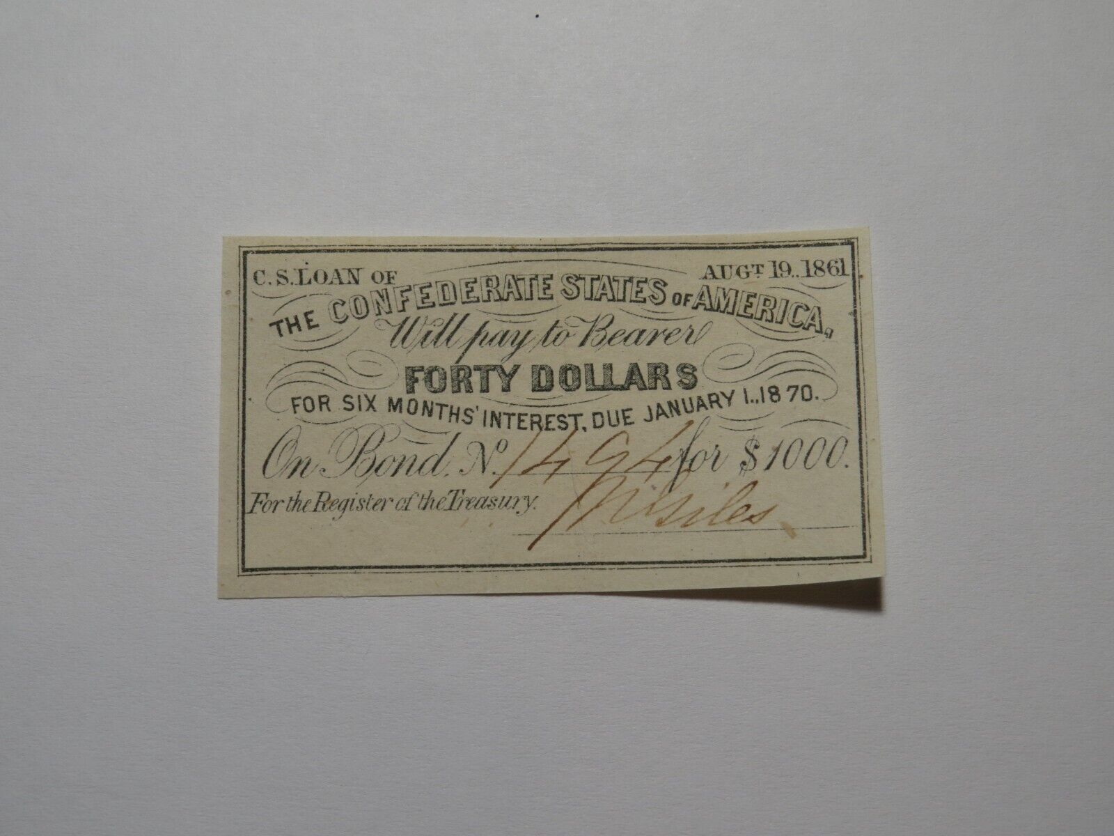 Up for auction is a $40 1861 Confederate Bond Coupon