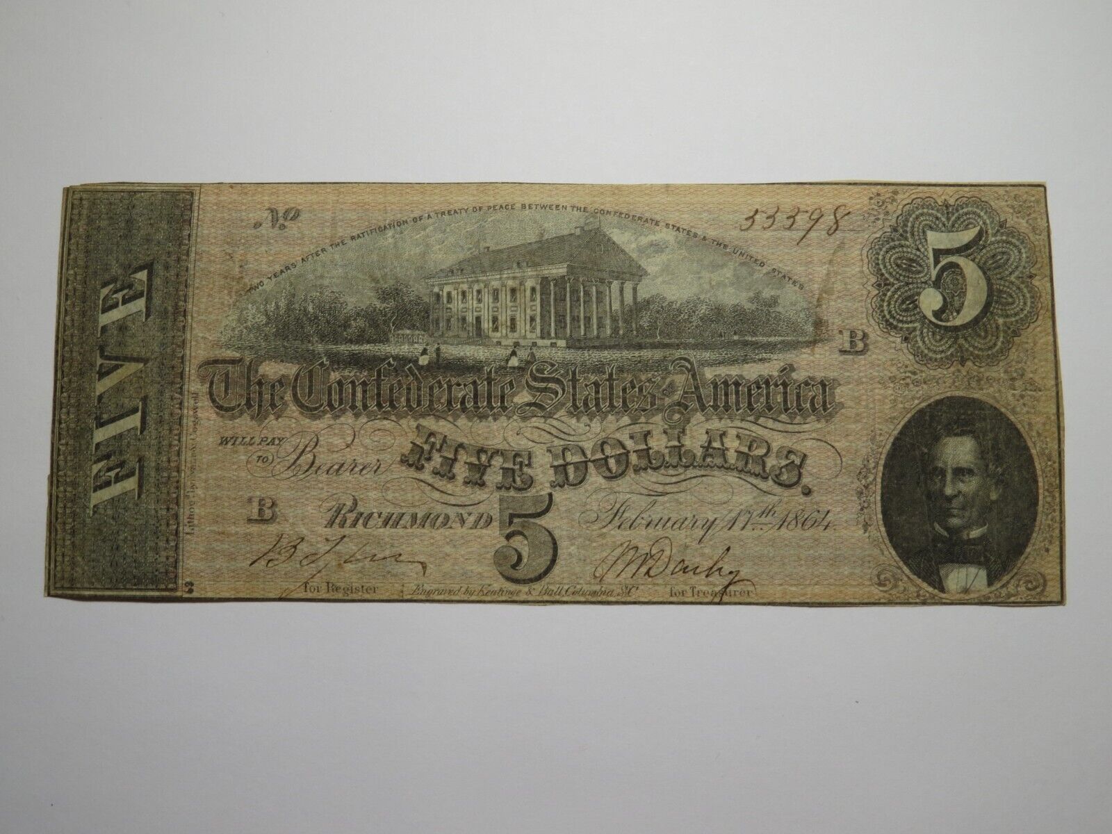Up for auction is a $5 1864 T69 Richmond Virginia Confederate Currency Note