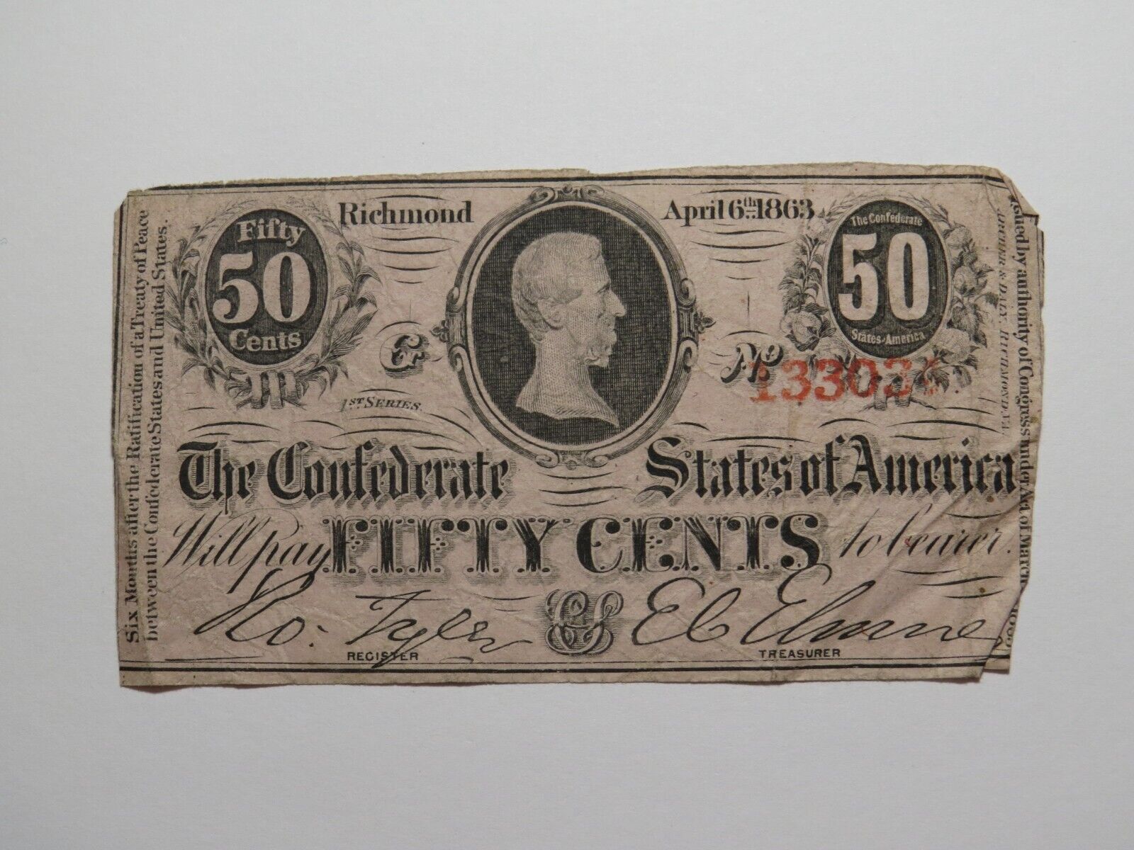 Up for auction is a $.50 1863 T63 Richmond Virginia Confederate Currency Note. This note is dated April 6, 1863. This note is in Fine condition. This bill is a must have for any collector of Confederate Currency!