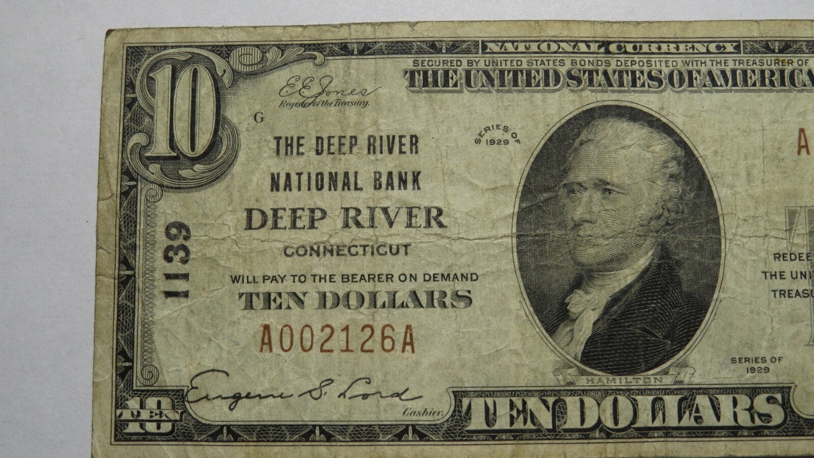 Up for auction is a $10 1929 Deep River Connecticut National Currency Note