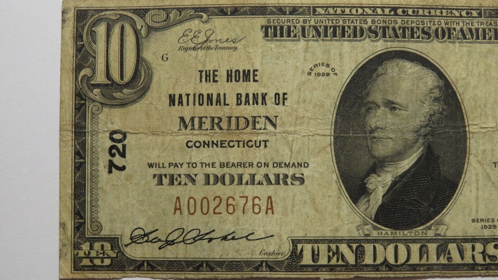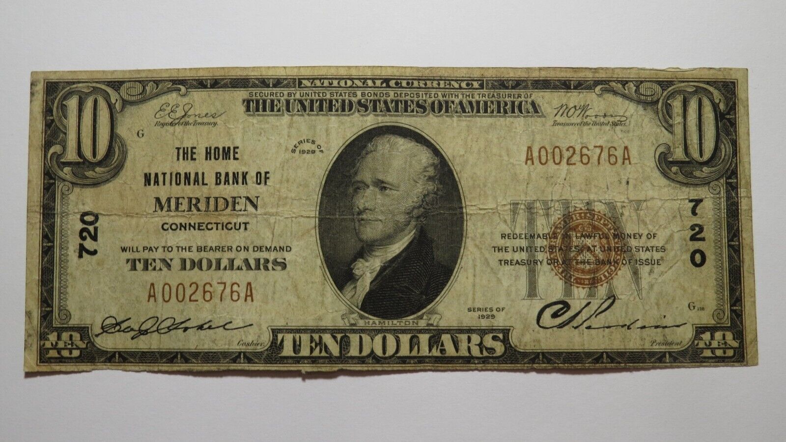 .  This note was issued by The Home National Bank of Meriden.  It is Charter #720.  Meriden is an always in demand Connecticut town!  This note has a good amount of crisp left to it and is in good shape with no major issues.  This bill is a must have for any collector of National Currency!