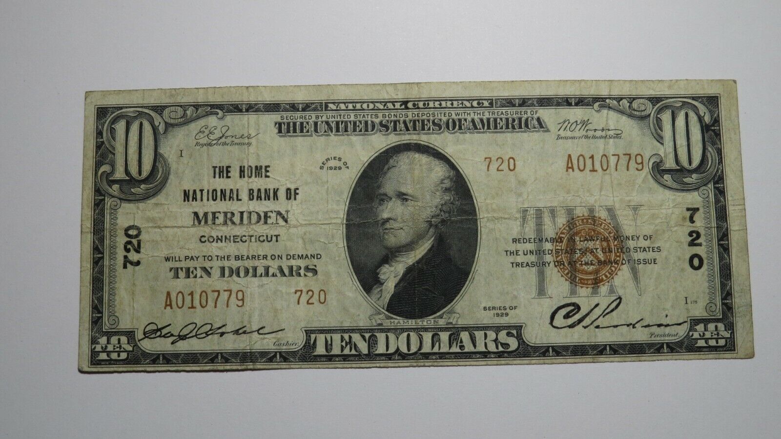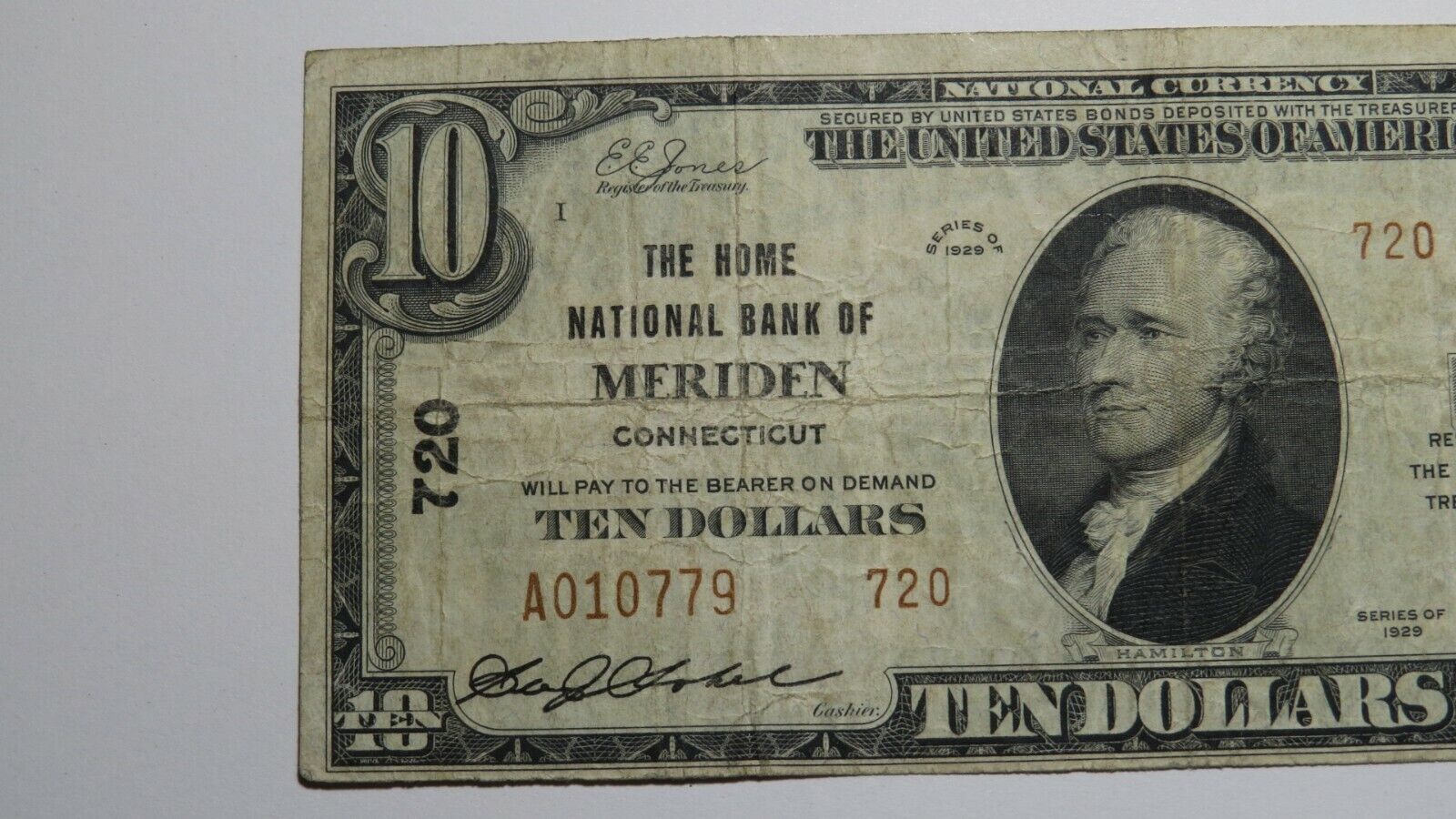 Up for auction is a $10 1929 Meriden Connecticut Type 2 National Currency Note. It is issued from The Home National Bank of Meriden. It is Charter #720. Meriden is an always in demand Connecticut town! This note has a good amount of crisp left to it and is in good shape with no issues. This bill is a must have for any collector of National Currency!