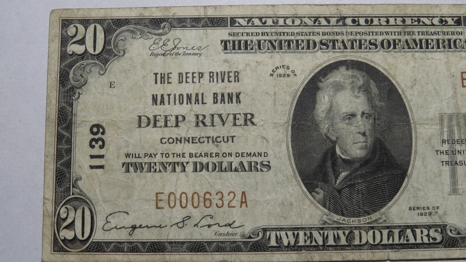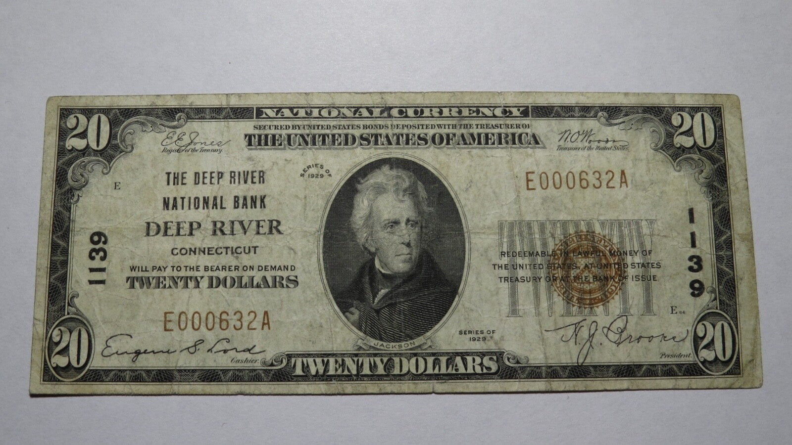 Up for auction is a $20 1929 Deep River Connecticut National Currency Note. It is issued from The Deep River National Bank. It is Charter #1139. This is a ONE BANK TOWN you will not find anywhere else! This note has a good amount of crisp left to it and is in great shape with no issues to speak of! This bill is a must have for any collector of National Currency!
