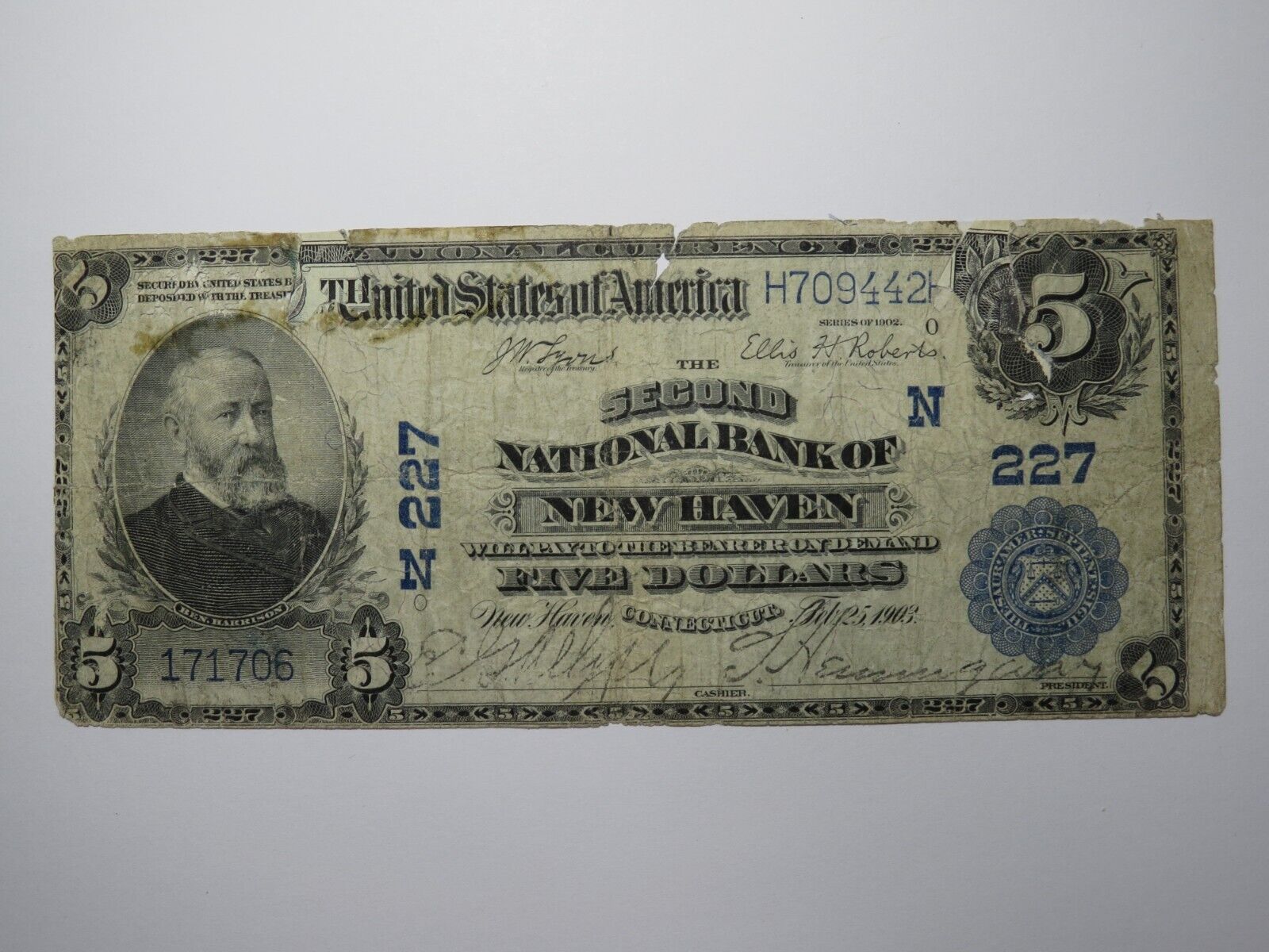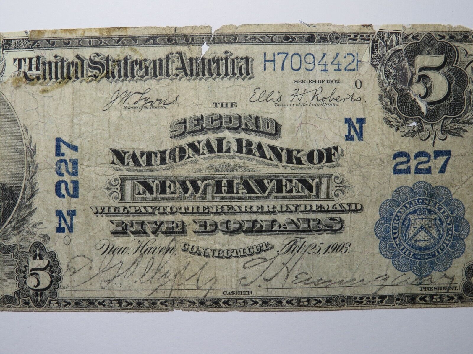 Up for auction is a $5 1902 New Haven Connecticut National Currency Note. This note was issued by The Second National Bank of New Haven. It is Charter #227. This is a tough to find New Haven Charter! This note is in circulated condition and does have a repair, but is still a great add from a tough to find Bank. This bill is a must have for any collector of National Currency!