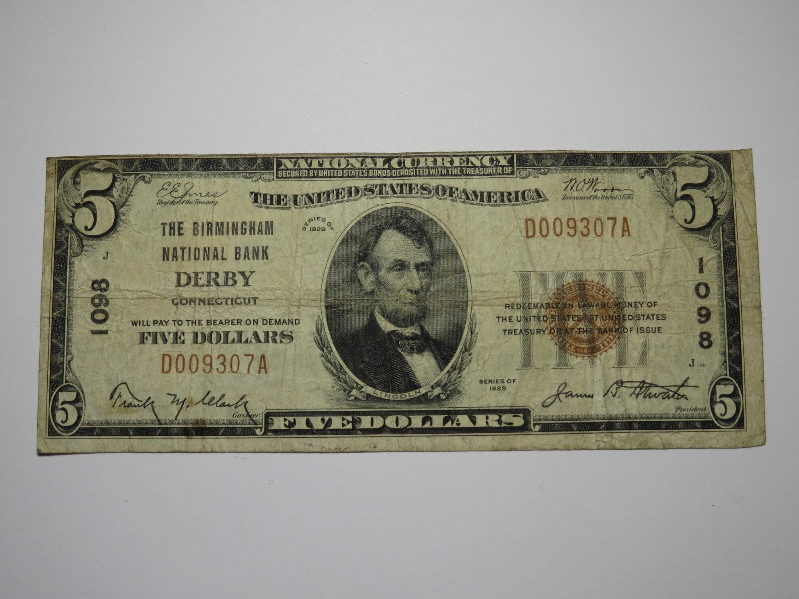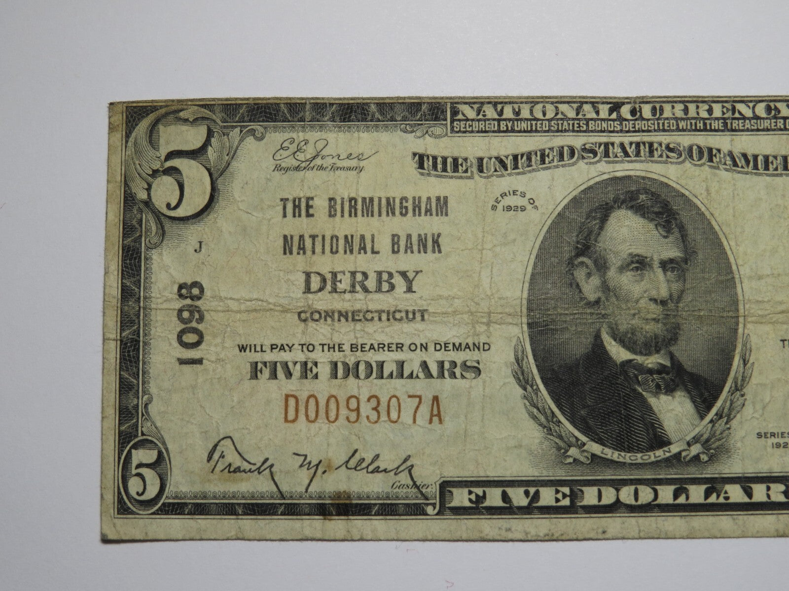 $5 1929 Derby Connecticut CT National Currency Bank Note Bill #1098 Birmingham