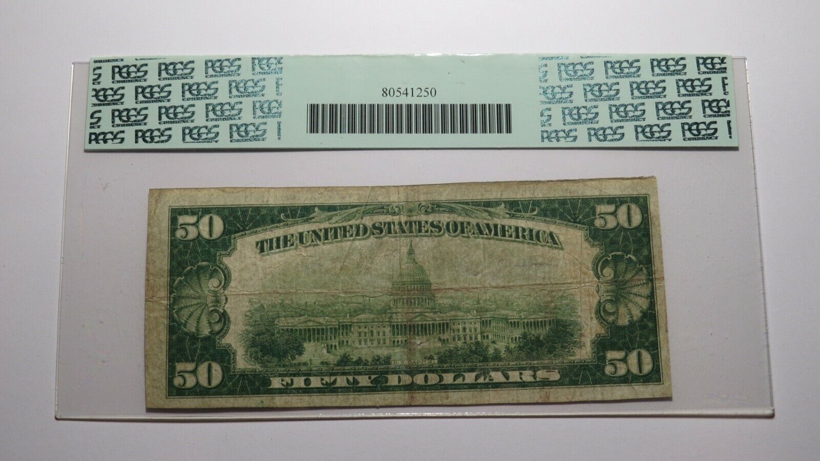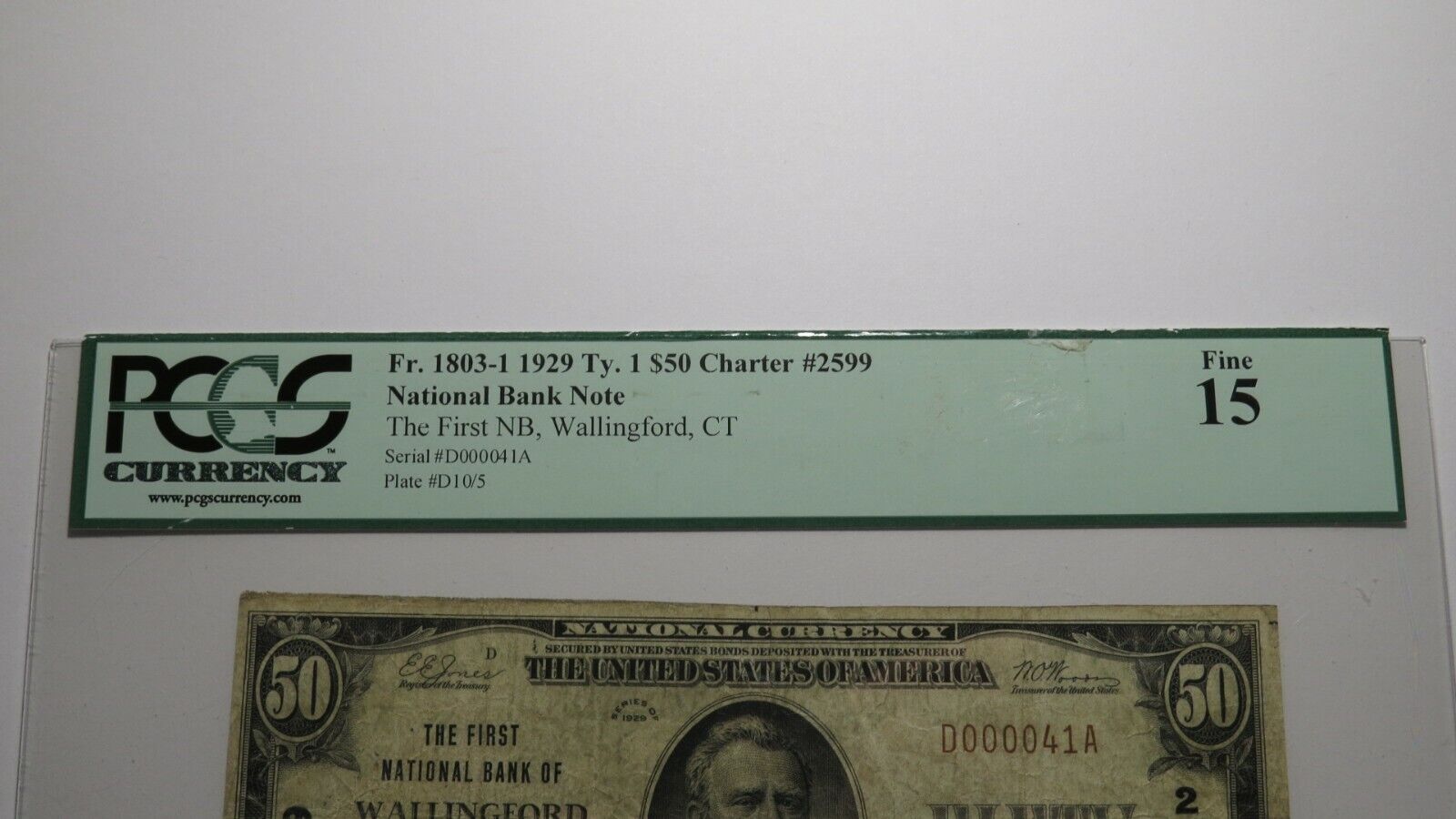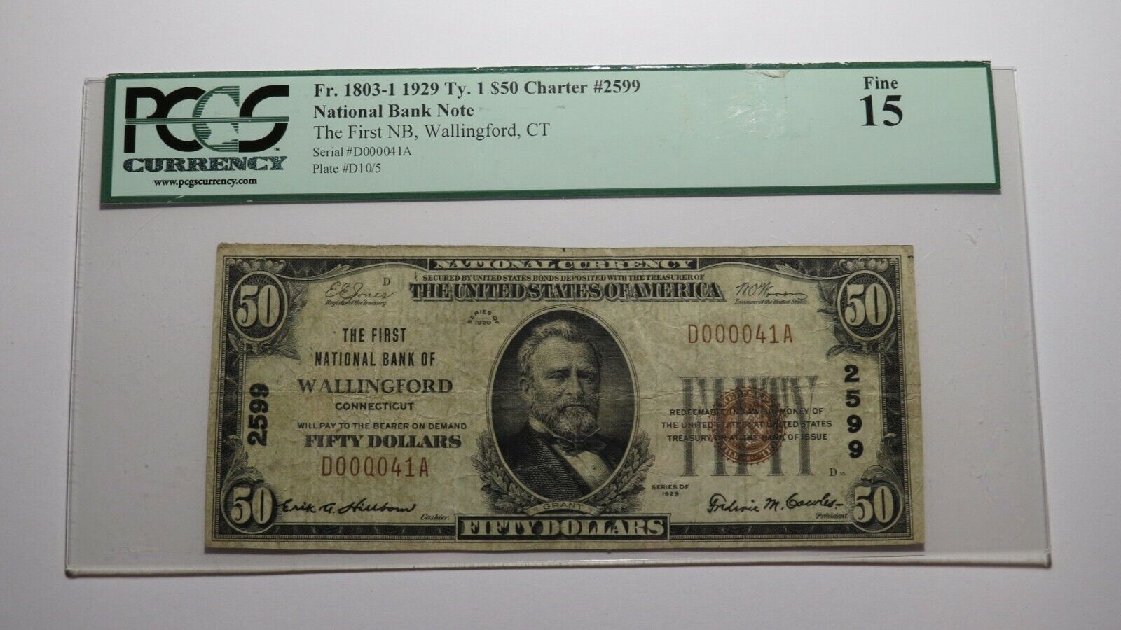 Up for auction is a $50 1929 Wallingford Connecticut Type 1 National Currency Note. It is issued from The First National Bank of Wallingford. It is Charter #2599. This is a ONE BANK TOWN you will not see for sale anywhere else! This bill has been graded Fine 15 by PCGS. There is nothing wrong with this note. This bill is a must have for any collector of National Currency!