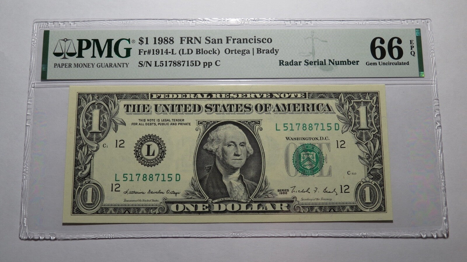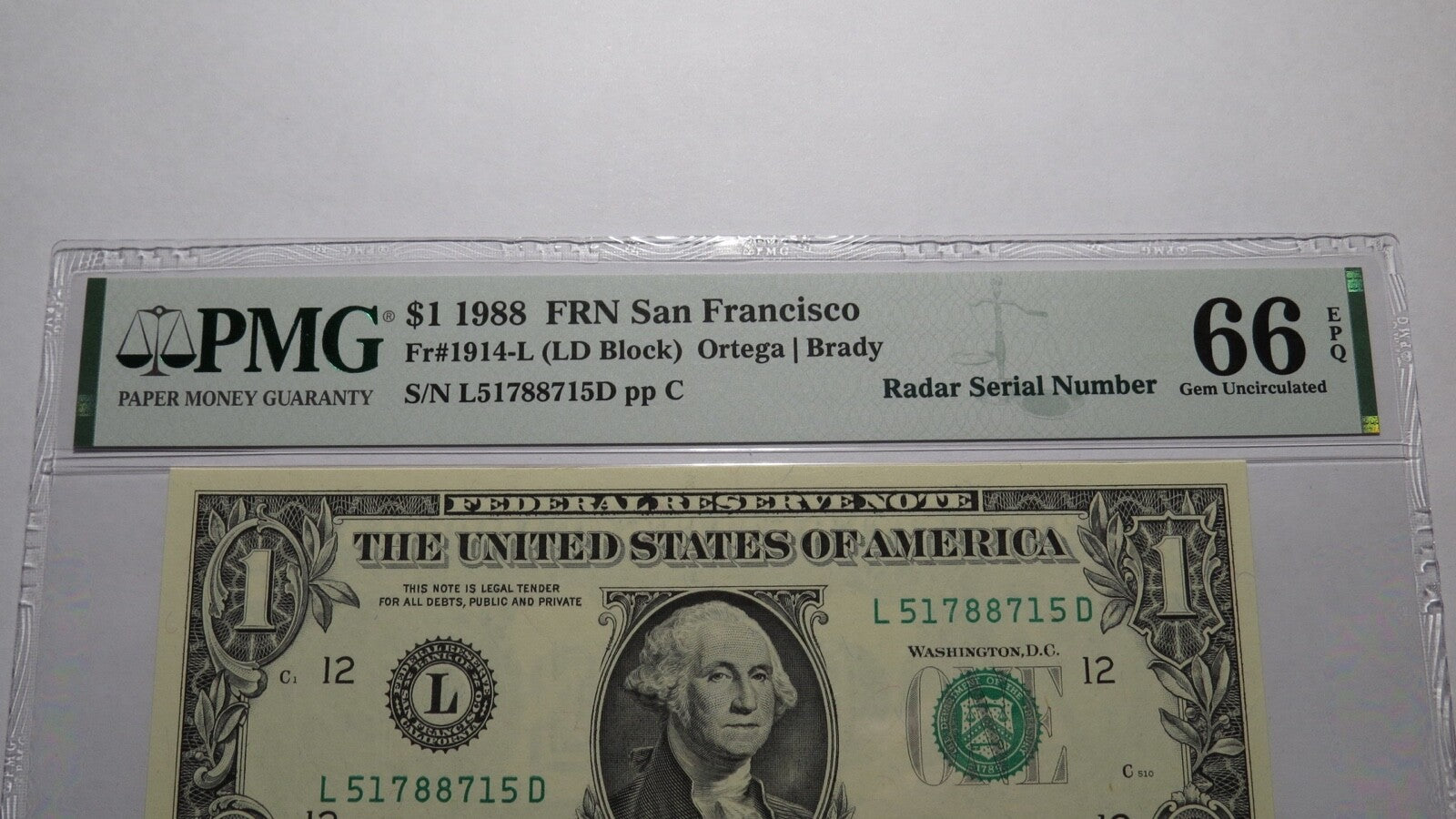 Up for auction is a $1 1988 Radar Serial Number Federal Reserve Note. This note was issued by the Federal Reserve Bank of San Francisco. This note has a Radar Serial Number (same number forwards and backwards). This note has been graded Gem Uncirculated 66EPQ by PMG! There is absolutely nothing wrong with this note! This note is a must have for any collector of Federal Reserve Notes!