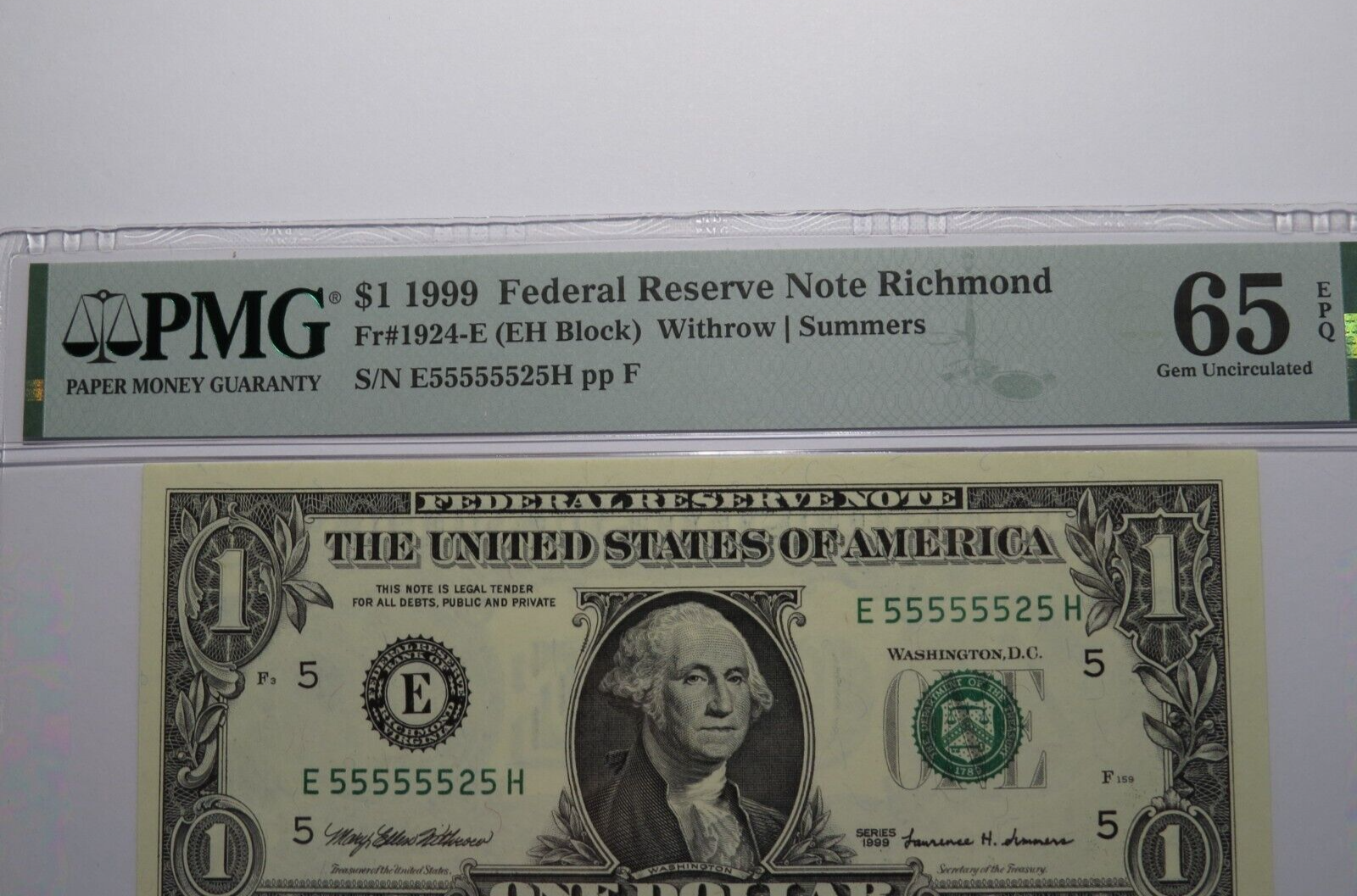 Up for auction is a $1 1999 Near Solid Serial Number Federal Reserve Note. This note was issued by The Federal Reserve Bank of Richmond. This note has been graded Gem Uncirculated 65EPQ by PMG. This is a problem free note. This bill is a must have for any collector of Federal Reserve Notes!