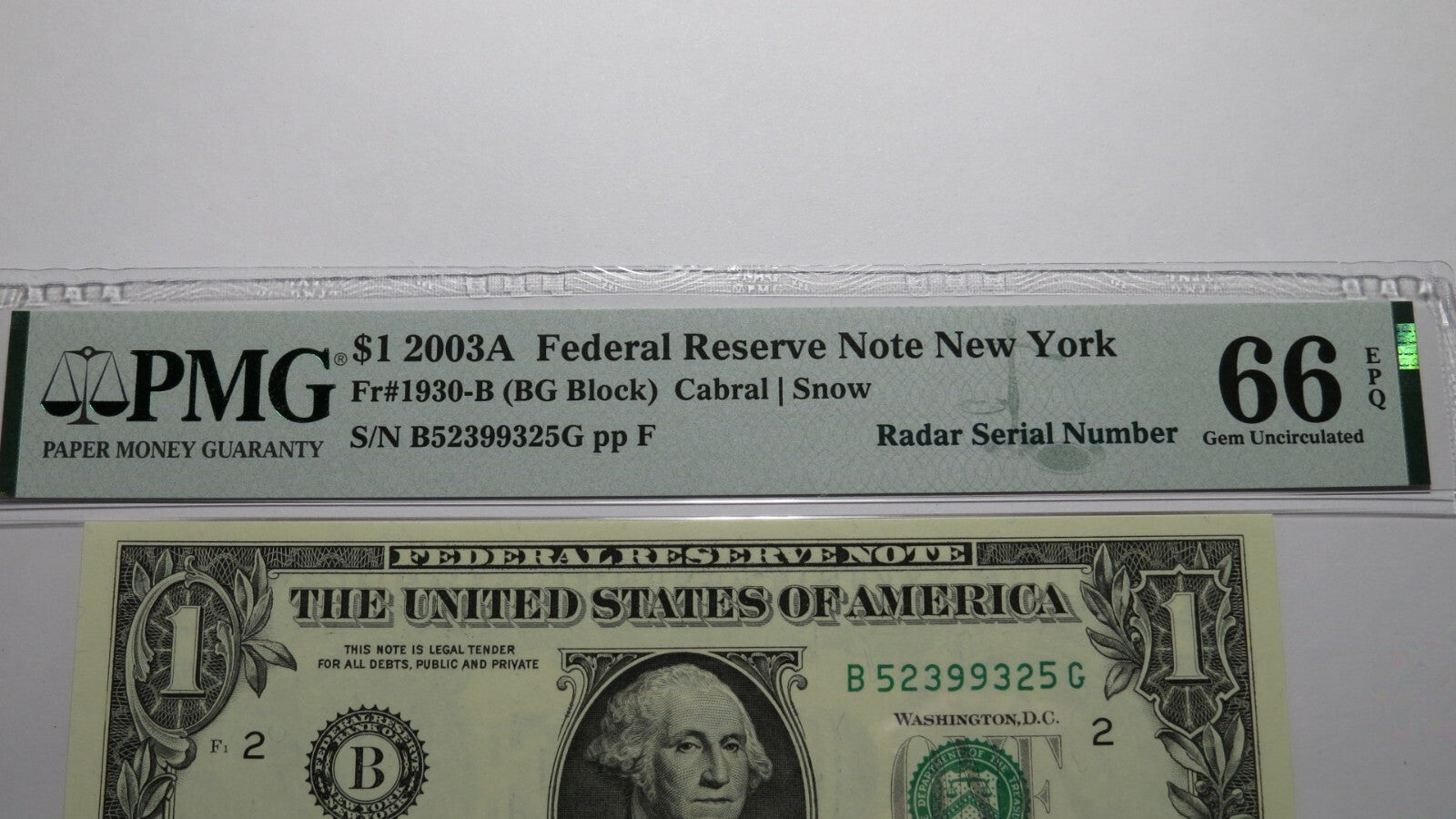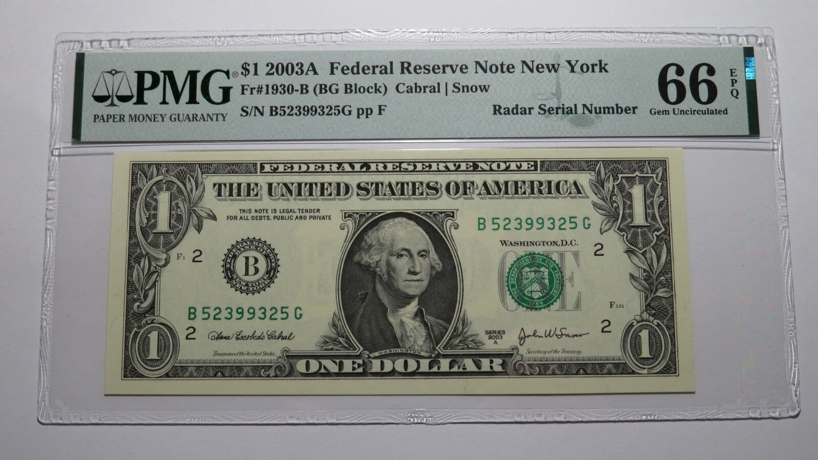 Up for auction is a $1 2003A Radar Serial Number Federal Reserve Note. This note was issued by the Federal Reserve Bank of New York. This note has a Radar Serial Number (same number forwards and backwards). This note has been graded Gem Uncirculated 66EPQ by PMG! There is absolutely nothing wrong with this note! This note is a must have for any collector of Federal Reserve Notes!
