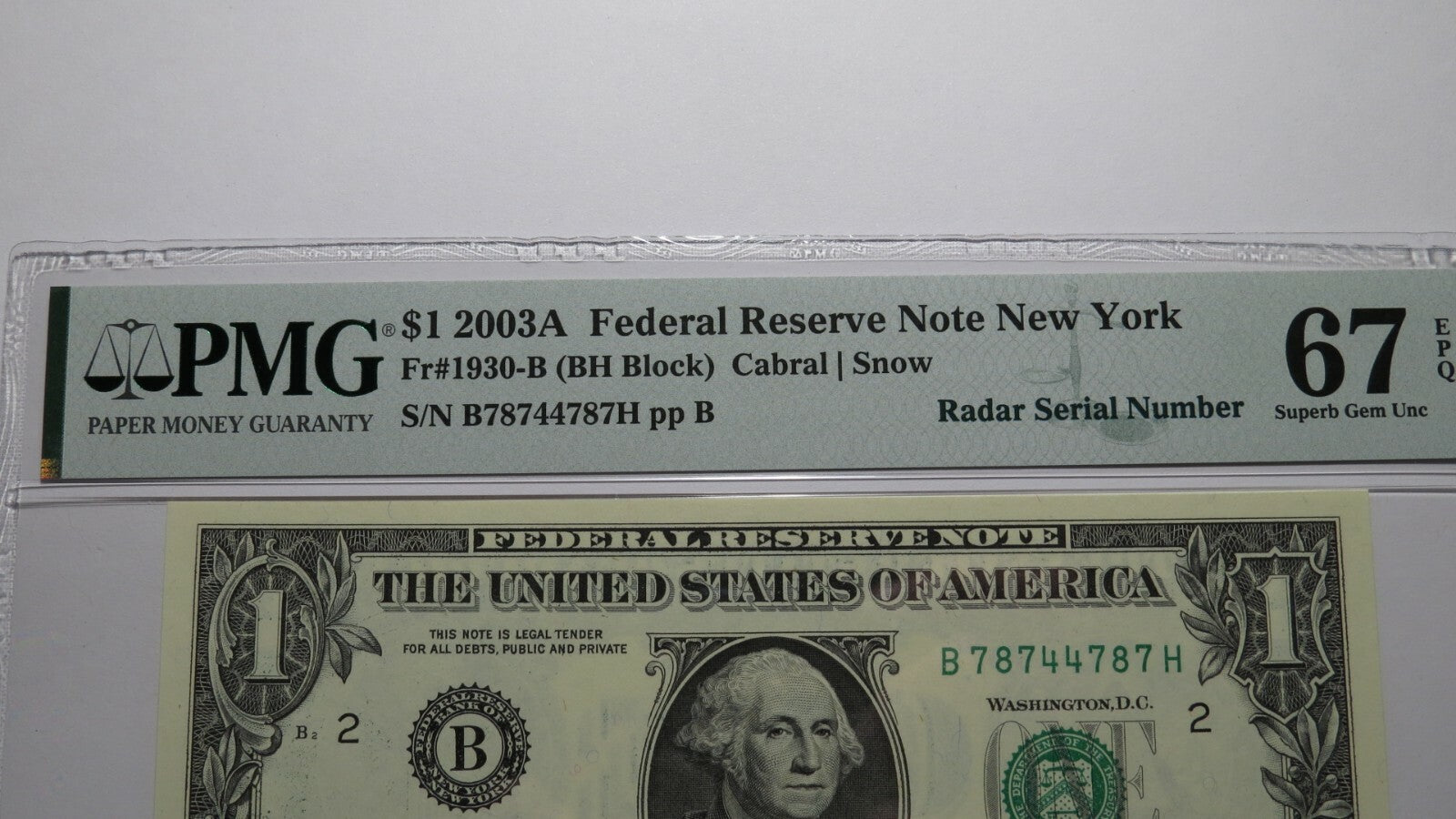 Up for auction is a $1 2003A Radar Serial Number Federal Reserve Note. This note was issued by the Federal Reserve Bank of New York. This note has a Radar Serial Number (same number forwards and backwards). This note has been graded Superb Gem Uncirculated 67EPQ by PMG! There is absolutely nothing wrong with this note! This note is a must have for any collector of Federal Reserve Notes!