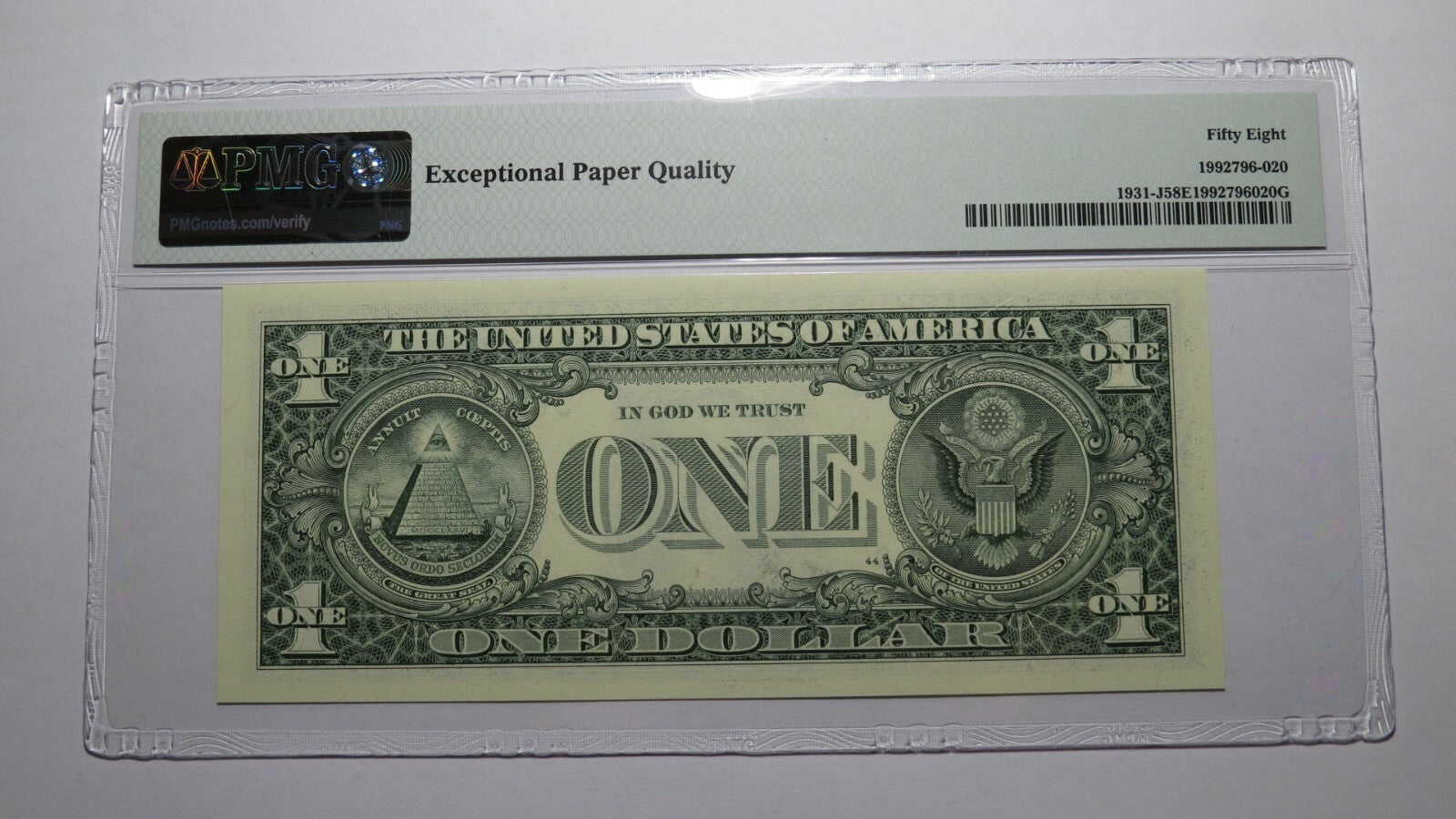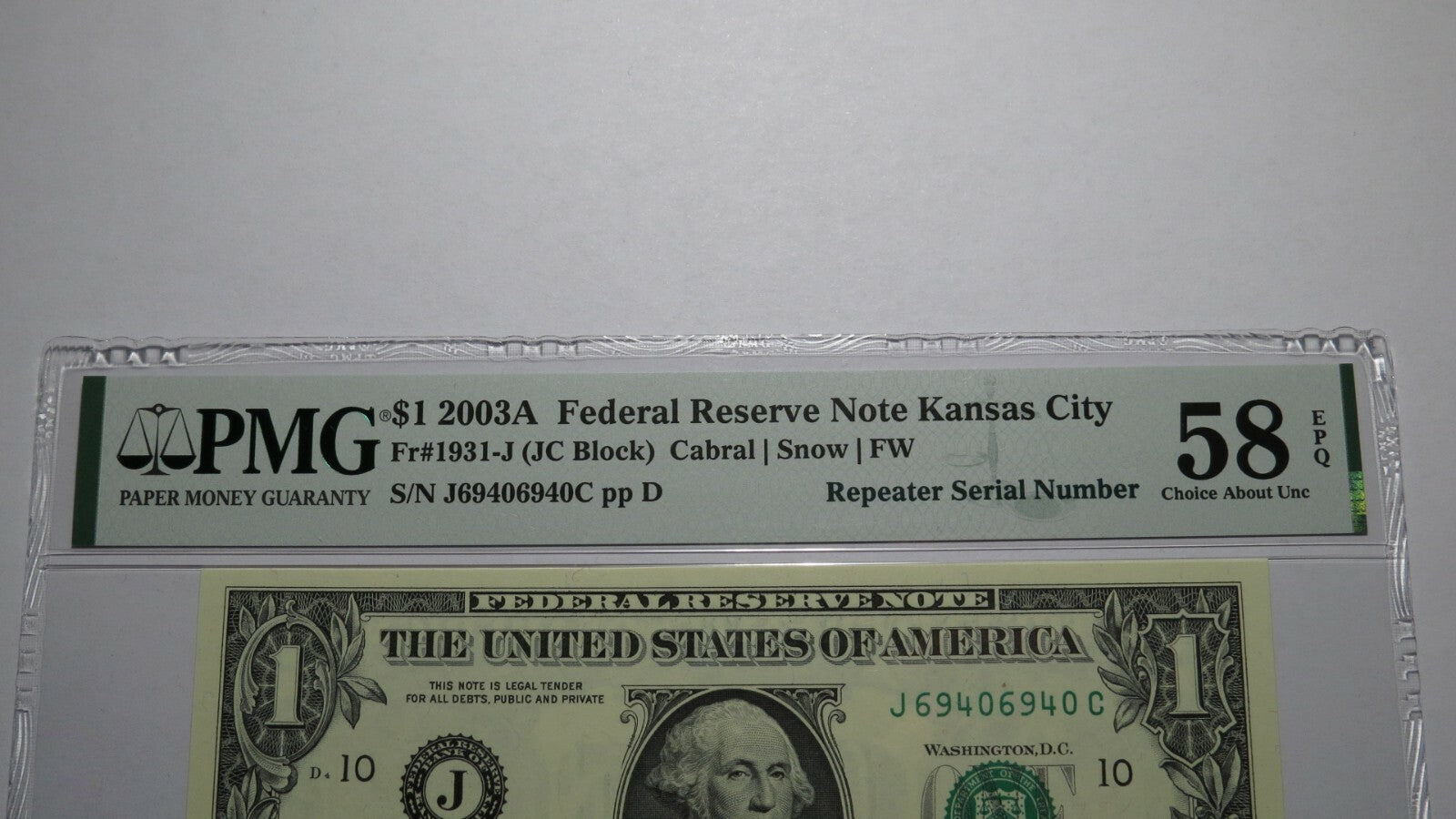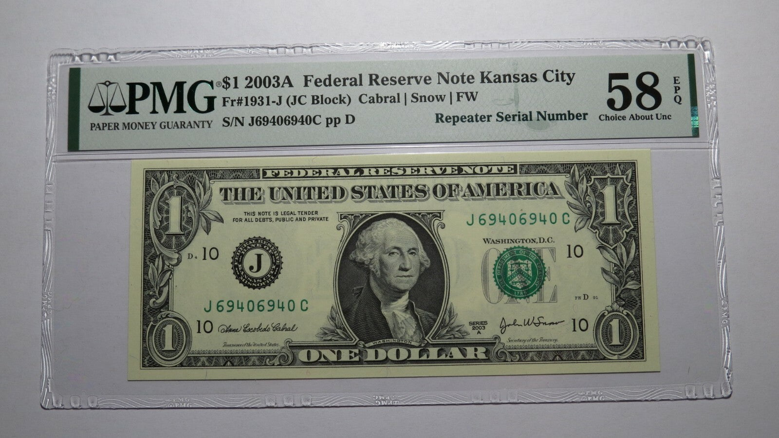 Up for auction is a $1 2003A Repeater Serial Number Federal Reserve Note. This note was issued by the Federal Reserve Bank of Kansas City. This note has a Repeater Serial Number. This note has been graded Choice About Uncirculated 58EPQ by PMG! There is absolutely nothing wrong with this note! This note is a must have for any collector of Federal Reserve Notes!