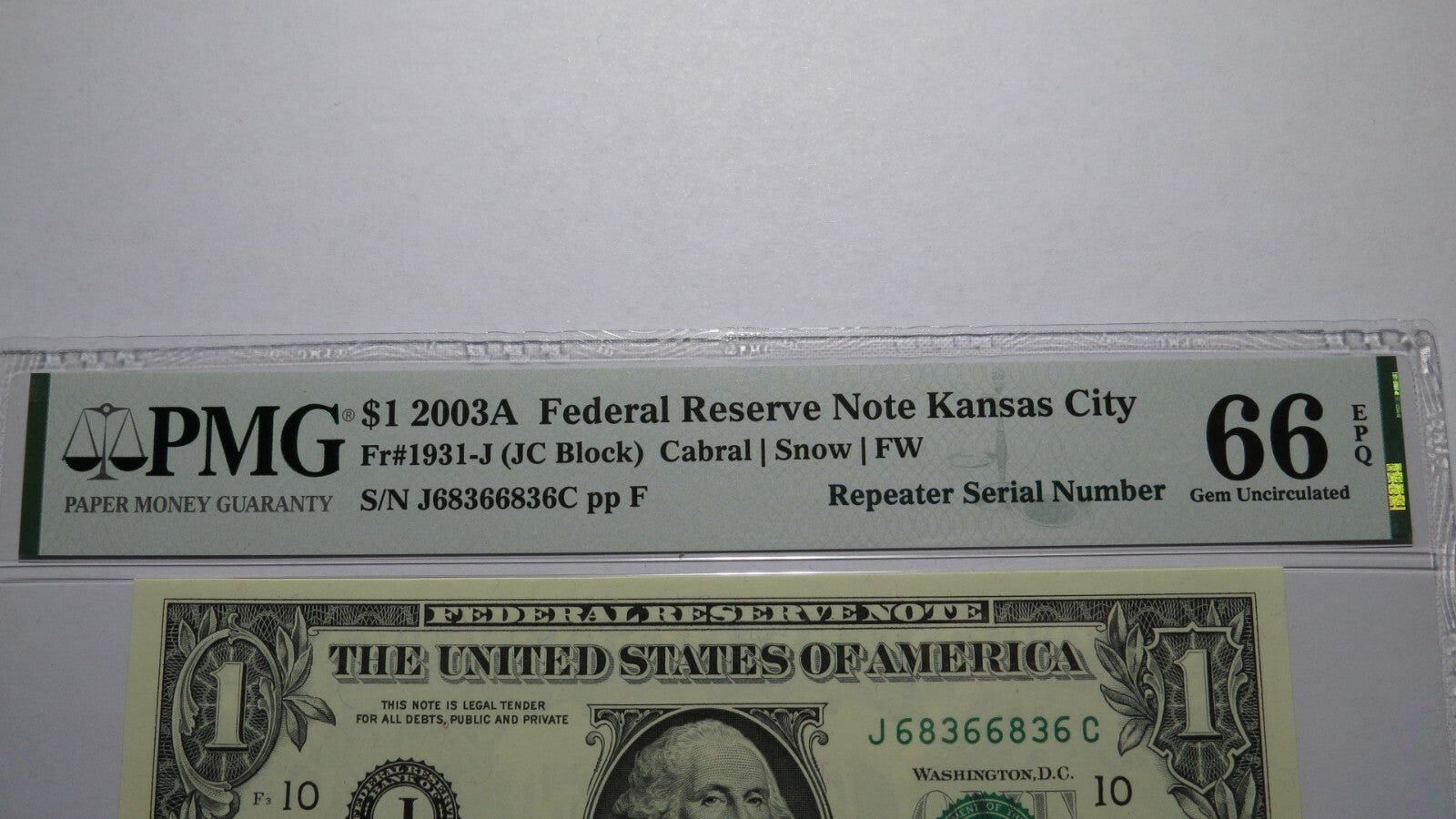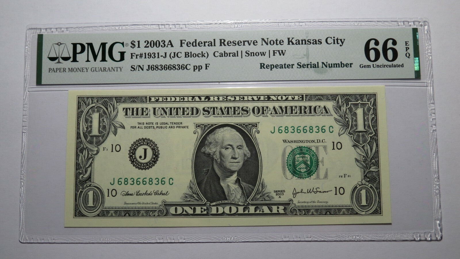 Up for auction is a $1 2003A Repeater Serial Number Federal Reserve Note. This note was issued by the Federal Reserve Bank of Kansas City. This note has a Repeater Serial Number. This note has been graded Gem Uncirculated 66EPQ by PMG! There is absolutely nothing wrong with this note! This note is a must have for any collector of Federal Reserve Notes!