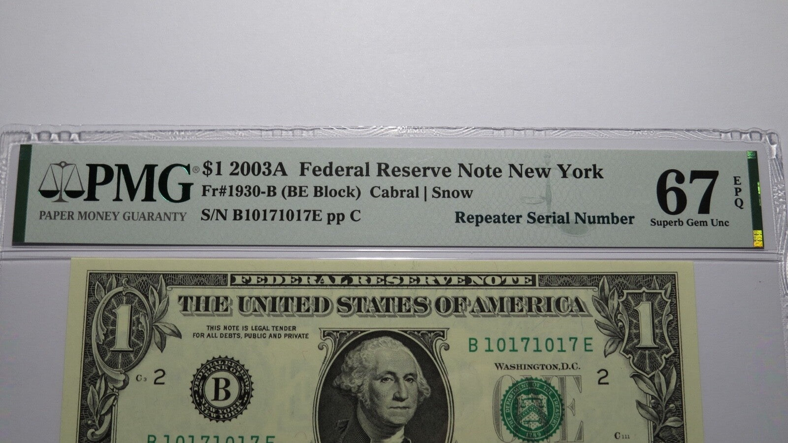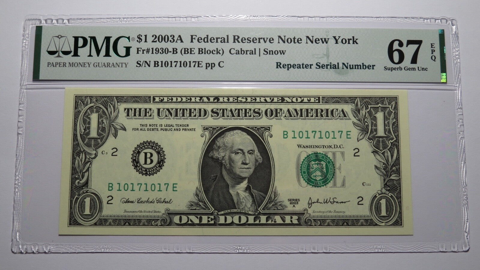 Up for auction is a $1 2003A Repeater Serial Number Federal Reserve Note. This note was issued by the Federal Reserve Bank of New York. This note has a Repeater Serial Number. This note has been graded Superb Gem Uncirculated 67EPQ by PMG! There is absolutely nothing wrong with this note! This note is a must have for any collector of Federal Reserve Notes!