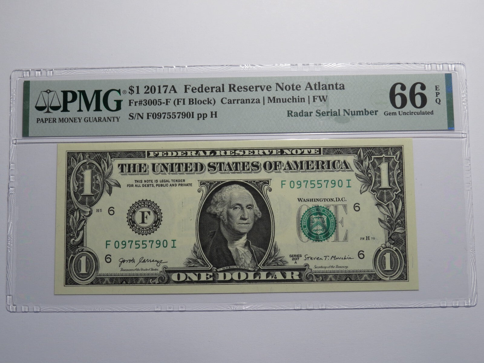 .  This note was issued by the Federal Reserve Bank of Atlanta.  This note has a Radar Serial Number (same number forwards and backwards).  This note has been graded Superb Gem Uncirculated 66EPQ by PMG!  There is absolutely nothing wrong with this note!  This note is a must have for any collector of Federal Reserve Notes!
