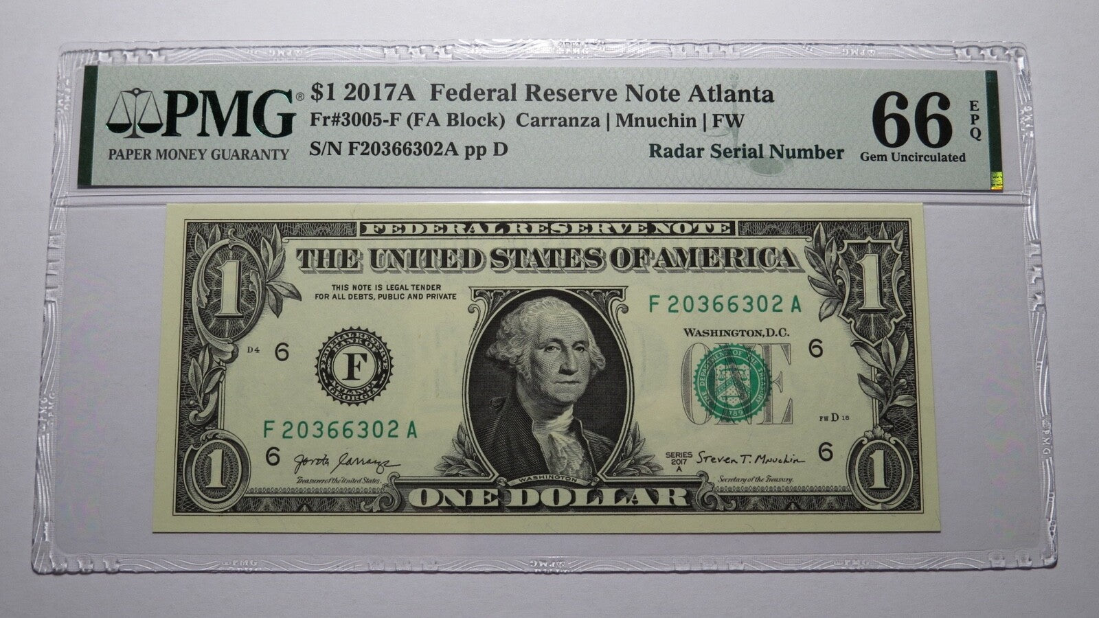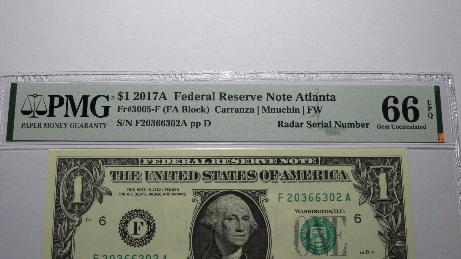 Up for auction is a $1 2017 Radar Serial Number Federal Reserve Note. This note was issued by the Federal Reserve Bank of Atlanta. This note has a Radar Serial Number (same number front/backwards). This note has been graded Gem Uncirculated 66EPQ by PMG! There is absolutely nothing wrong with this note! This note is a must have for any collector of Federal Reserve Notes!