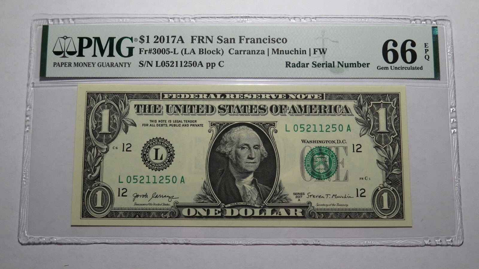 Up for auction is a $1 2017 Radar Serial Number Federal Reserve Note. This note was issued by the Federal Reserve Bank of San Francisco. This note has a Radar Serial Number (same number front/backwards). This note has been graded Gem Uncirculated 66EPQ by PMG! There is absolutely nothing wrong with this note! This note is a must have for any collector of Federal Reserve Notes!