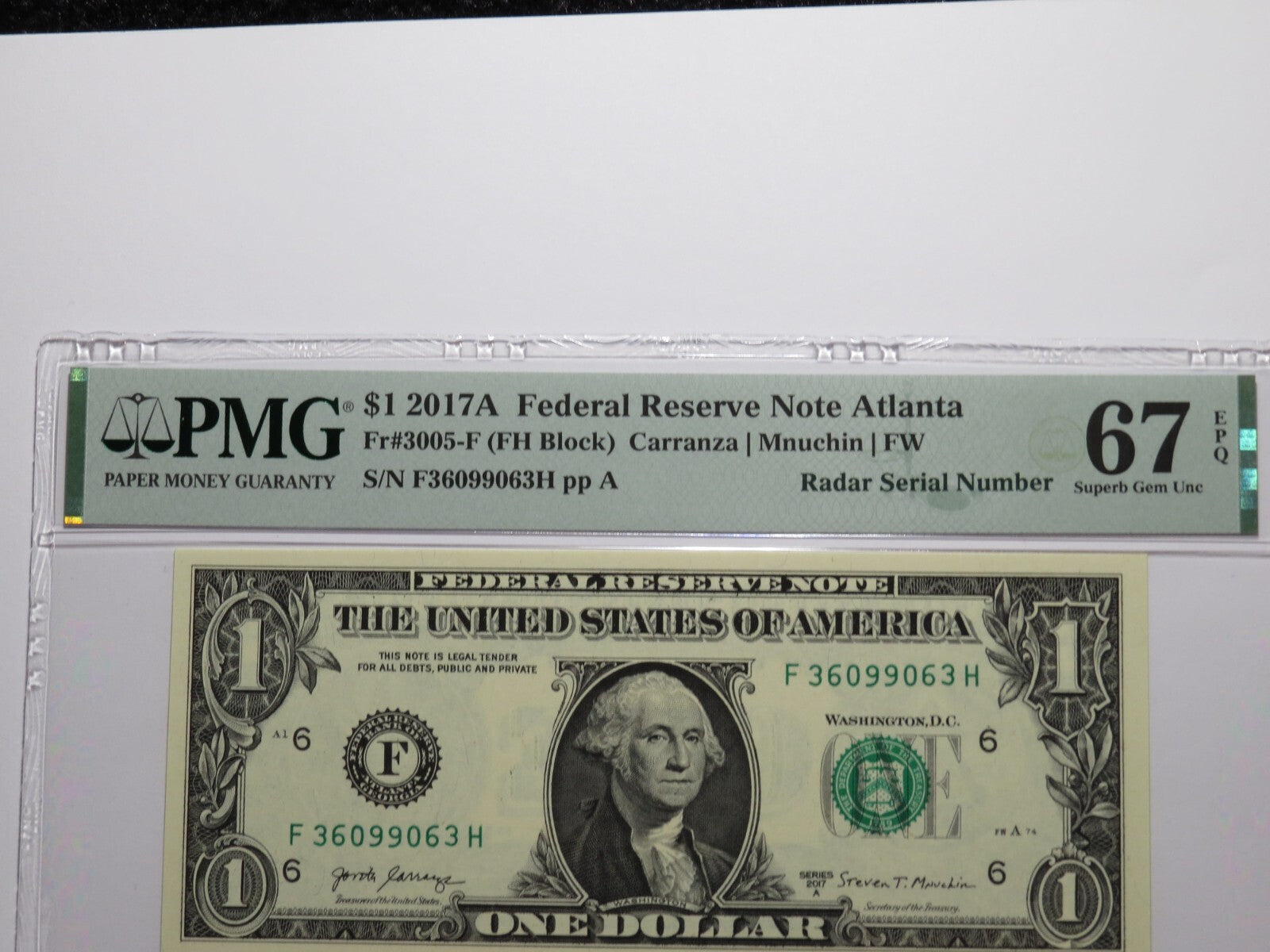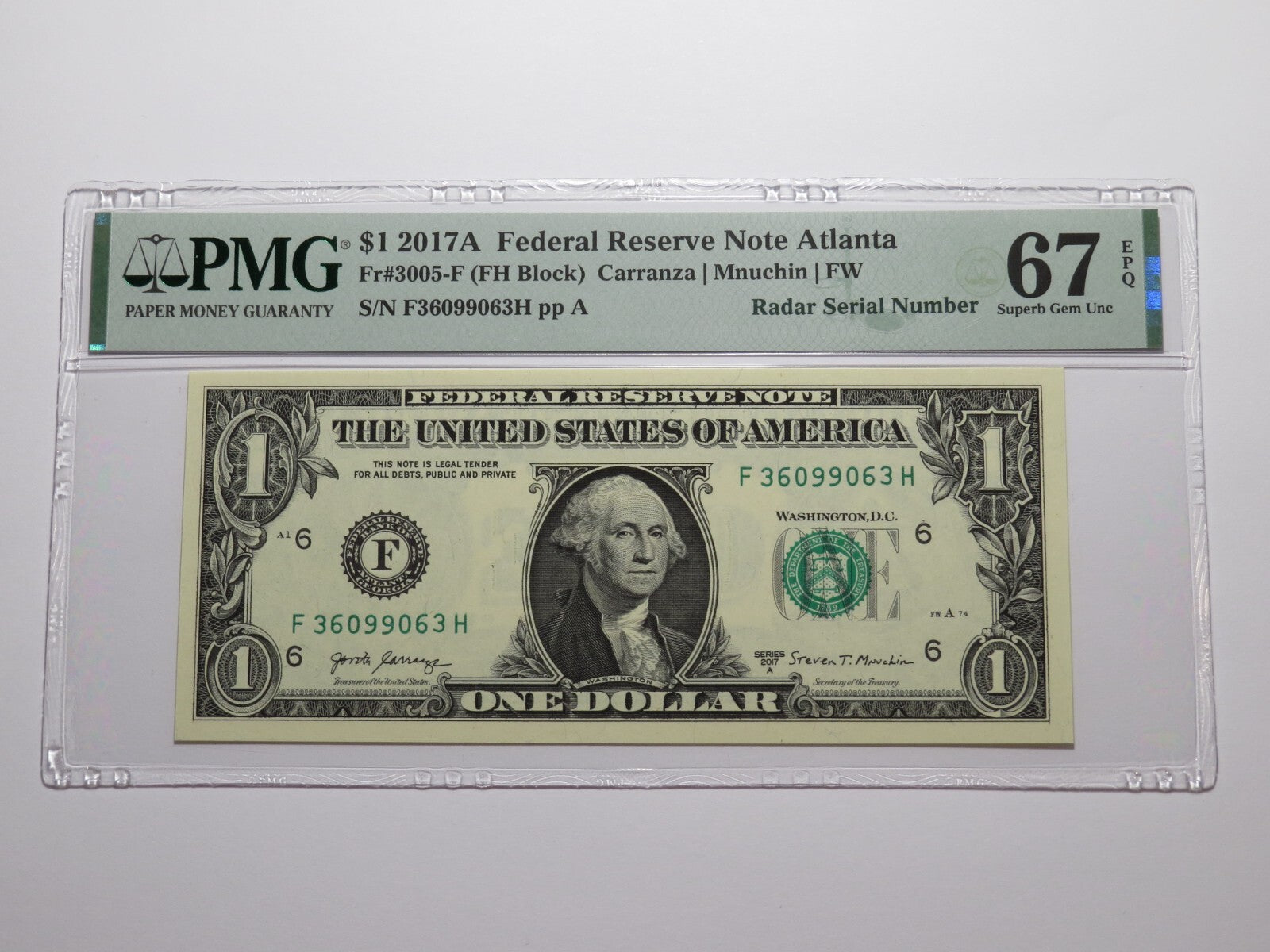 Up for auction is a $1 2017 Radar Serial Number Federal Reserve Note. This note was issued by the Federal Reserve Bank of Atlanta. This note has a Radar Serial Number (same number forwards and backwards). This note has been graded Superb Gem Uncirculated 67EPQ by PMG! There is absolutely nothing wrong with this note! This note is a must have for any collector of Federal Reserve Notes!