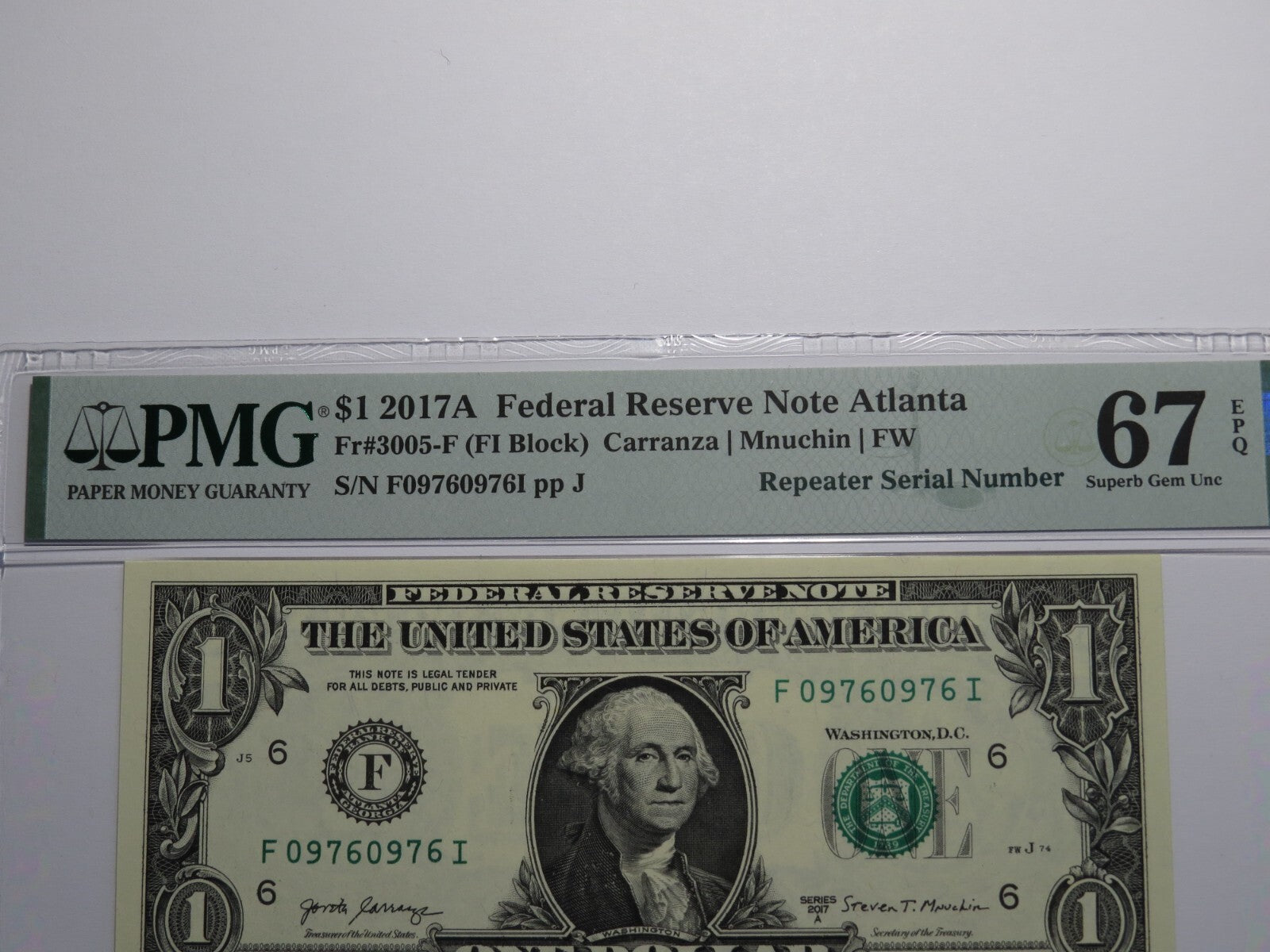 Up for auction is a $1 2017A Repeater Serial Number Federal Reserve Note. This note was issued by the Federal Reserve Bank of Atlanta. This note has a Repeater Serial Number. This note has been graded Superb Gem Uncirculated 67EPQ by PMG! There is absolutely nothing wrong with this note! This note is a must have for any collector of Federal Reserve Notes!