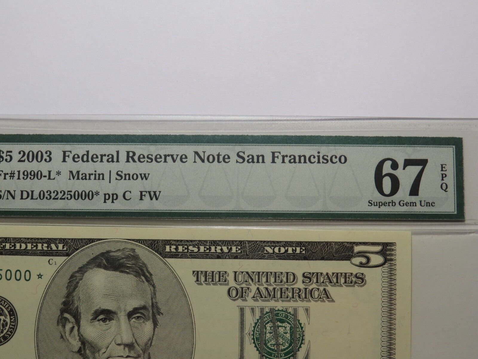 Up for auction is a $5 2003 Federal Reserve Star Note. This note was issued by the Federal Reserve Bank of San Francisco. This note has been graded Superb Gem Uncirculated 67EPQ by PMG. There is absolutely nothing wrong with this note! This note is a must have for any collector of Federal Reserve Notes! If you have any questions please feel free to ask!
