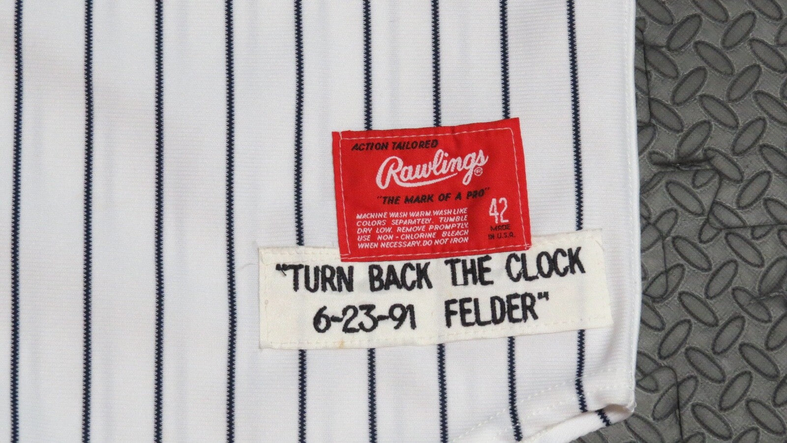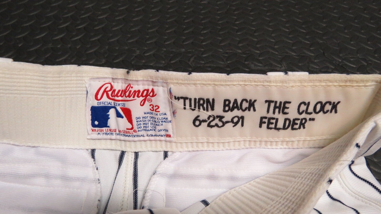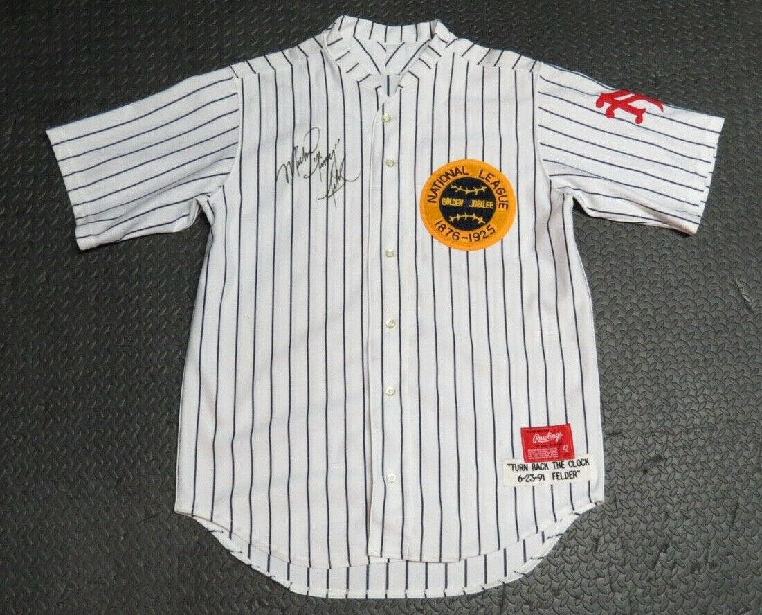 Up for auction is a 1991 Mike Felder San Francisco Giants Game Worn 1925 TBTC Full Uniform.  This uniform was worn by Mike Felder on June 23, 1991.  The Giants would win this game 2-1.  Felder had a walk off suicide squeeze to score Matt Williams in the Bottom of the 9th Inning of this game.  This moment was captured and used for Felder's 1992 Score Baseball Card.  I was able to conclusively photomatch the jersey to the card by using the pinstripes and the logo on the left arm.  This jersey is made by Rawlings and is a size 42. This jersey has been signed on the front by Felder.  This jersey shows light usage.  The Pants are made by Rawlings and are a size 32.  The buyer will also receive Felder's stirrups from the game.  If you have any questions please feel free to ask!