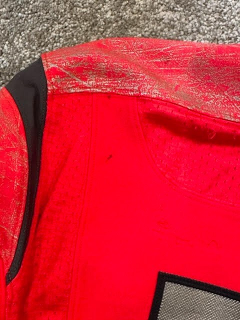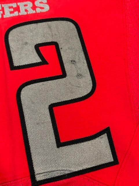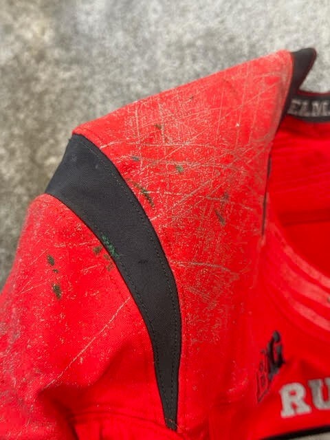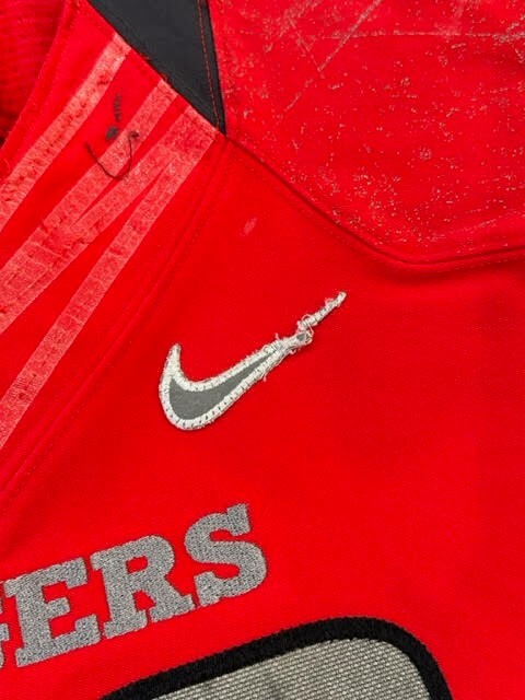 Up for auction is a 2014 Kaleb Johnson Rutgers Scarlet Knights Game Worn Home Nike Jersey. This jersey is from the 2014 Rutgers Football Season and is affixed with the Big Ten Patch. This jersey was worn by Kaleb Johnson but the nameplate has been removed per NCAA rules (at the time). This shows heavy usage with multiple repairs, paint transfers and hit marks throughout. This jersey is a size 44. Don't miss this chance to own a great looking gamer from one of the best conferences in the NCAA!