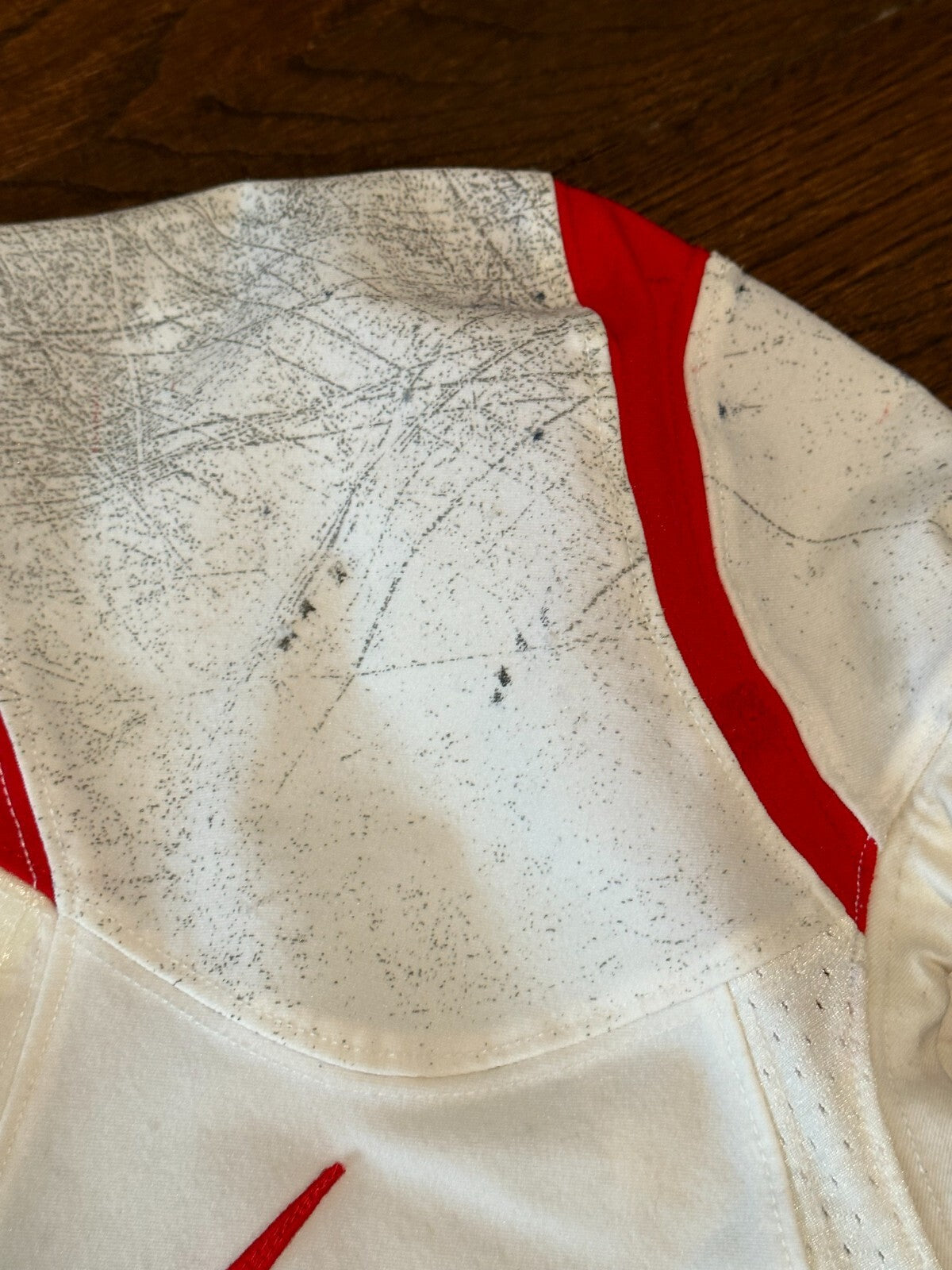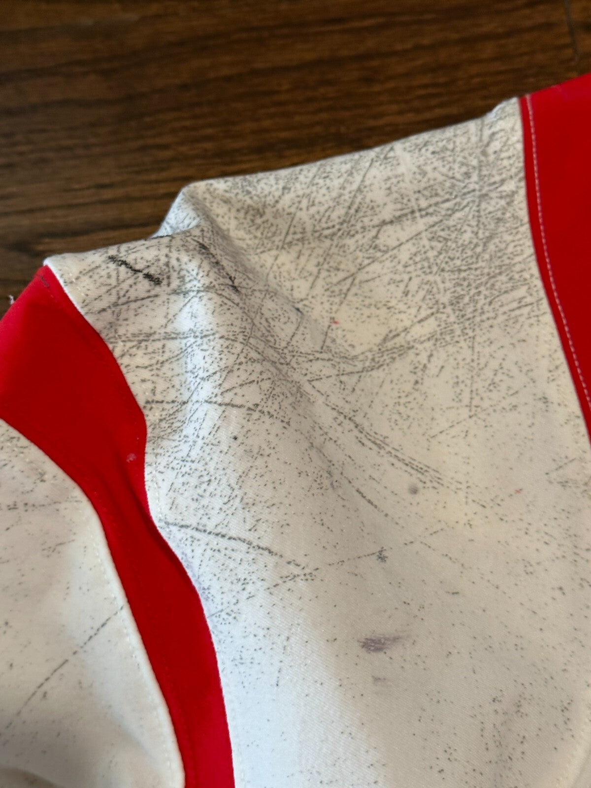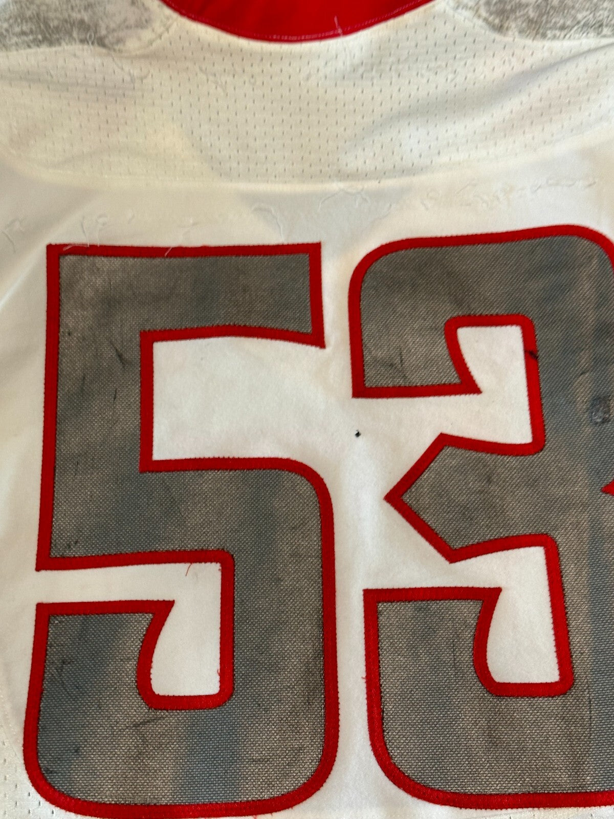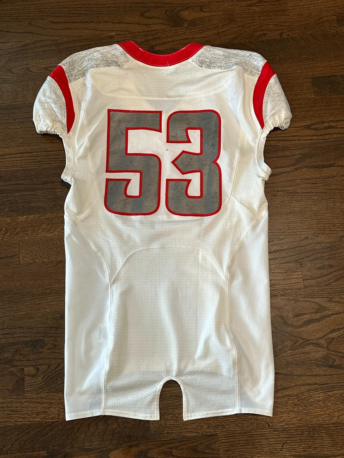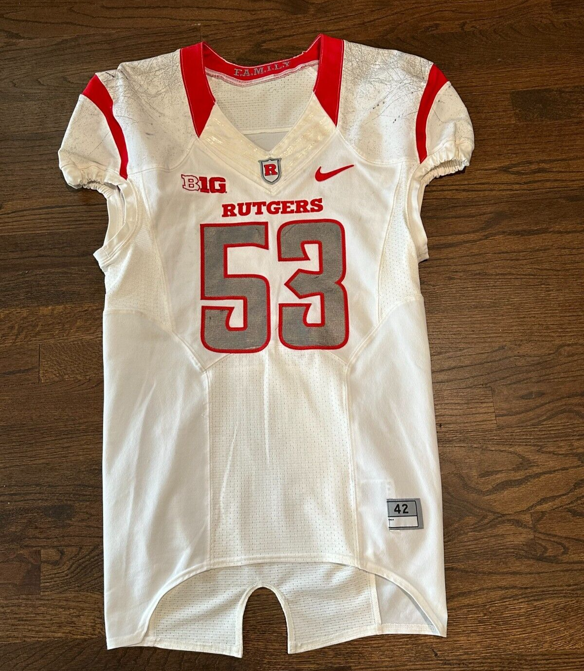 Up for auction is a 2015 Rutgers Scarlet Knights Game Worn White Nike Jersey.  This jersey is from the 2015 Rutgers Football Season and was worn by Julian Pinnix-Odrick!  As per NCAA regulations, the nameplate has been removed from this jersey, and the jersey does show solid game use with a few repairs and hit marks throughout!  This jersey is a size 42.  Rutgers Big 10 jerseys are very difficult to come by, and are truly some of the best looking jerseys in school history!  Don't miss this chance to own a great looking gamer from one of the best conferences in the NCAA!